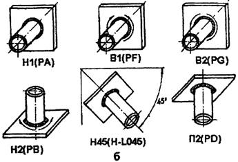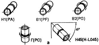 Н1 - нижнее при горизонтальном расположении осей труб (трубы), свариваемых (привариваемой) с поворотом, Н2 - нижнее при вертикальном расположении оси трубы, привариваемой без поворота или с поворотом; B1 - переменное при горизонтальном расположении осей труб (трубы), свариваемых (привариваемой) без поворота «на подъем»; B2 - переменное при горизонтальном расположении осей труб (трубы), свариваемых (привариваемой) без поворота «на спуск», Г - горизонтальное при вертикальном расположении осей труб, свариваемых без поворота или с поворотом; Н45 - переменное при наклонном расположении осей труб (трубы), свариваемых (привариваемой) без поворота, П2 - потолочное при вертикальном расположении оси трубы, привариваемой без поворота или с поворотом