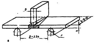 Рис.7. Схемы испытаний на статический изгиб со стороны усиления шва (а), со стороны корня шва (б) и на боковой изгиб - изгиб "на ребро" (в) образцов из контрольных стыковых сварных соединений листов и труб: D - диаметр пуансона, L - длина образца; b = 1,5t, но не менее 20 мм; D = 2t или D = 2h; r=t, но не более 25 мм; К £ D+3t; L=D+3h