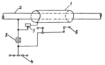 Рис.6. Схема защиты кожуха с помощью протекторов, устанавливаемых с двух сторон кожуха: 1 - кожух; 2 - трубопровод; 3 - регулируемое сопротивление; 4 - протекторы; 5 - катодная станция; 6 - анодное заземление 2.9. Наладку системы электрохимической защиты на кожухе осуществляют путем подбора действующего значения регулируемого сопротивления. 2.10. При реализации схем защиты, указанных на рис. 2, 3, 5, 6, установку дополнительных анодных заземлителей и протекторов предусматривает с интервалом 5-10 м между соседними электродами. 2.11. На кожухах протяженностью более 40 м дополнительные анодные заземлители или протекторы следует устанавливать с обеих сторон кожуха. 2.12. Общее количество анодных заземлителей или протекторов при любых условиях должно быть не менее двух - по одному на каждом конце кожуха. 3. РАСЧЕТ ПАРАМЕТРОВ ЭЛЕКТРОХИМИЧЕСКОЙ ЗАЩИТЫ ТРУБОПРОВОДОВ С КОЖУХОМ3.1. Величину тока, необходимую для защиты участка трубопровода с кожухами на переходах, определяют по формуле