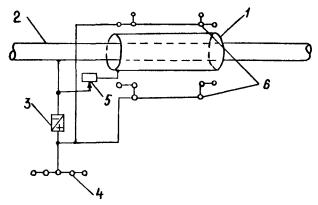 Рис. 5. Схема защиты кожуха с помощью протекторов, устанавливаемых с одной стороны кожуха: 1 - кожух; 2 - трубопровод; 3 - регулируемое сопротивление; 4 - протекторы; 5 - катодная станция; 6 - анодное заземление