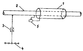 Рис. 1. Схема катодной защиты кожуха при близком расположении катодной станции: 1 - кожух; 2 - трубопровод; 3 - катодная - станция; 4 - анодное заземление; 5 - регулируемое сопротивление