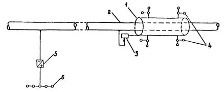 Рис. 2. Схема катодной защиты кожуха с использованием анодных заземлителей, расположенных с одной стороны кожуха: 1 - кожух; 2 - трубопровод; 3 - катодная станция; 4 - анодное заземление; 5 - регулируемое сопротивление; 6 - дополнительные анодные заземлители