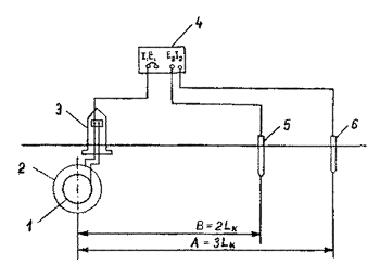 Рис.7. Схема измерения переходного сопротивления кожуха: 1 - трубопровод; 2 - кожух; 3 - контрольно - измерительный пункт; 4 - прибор для измерения сопротивления заземлений; I1, I2 - токовые клеммы прибора; Е1, Е2 - клеммы напряжения прибора; 5 - измерительный электрод; 6 - токовый электрод; В - расстояние между трубопроводом и измерительный электродом; А - расстояние между трубопроводом и токовым электродом; LК - длина кожуха 4.5. Измеренная величина переходного сопротивления кожуха характеризует фактическое состояние изоляционного покрытия и используется при расчете параметров защитных установок. 4.6. Измерение переходного сопротивления выполняют на кожухе, не имеющем электрического контакта с трубопроводом при отключенных ближайших средствах электрохимической защиты. 4.7. Допустима оценка