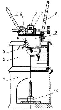 1 - подставка для бани над газовой горелкой; 2 - баня; 3 - славное отверстие; 4 - термометр для тигля; 5 - шаблон для контроля величины пламени; 6 - конус пламени; 7 - паровая камера; 8 - термометр для бани; 9 - испытательный тигель; 10 - газовая горелка Рисунок 1 - Аппарат Тага для определения температуры вспышки в закрытом тигле 7.3 Для каждого испытания требуется не менее 50 см3 образца. Отбор проб следует проводить по АСТМ Д 4057 или в соответствии со стандартами приложения ДА. 8 Подготовка аппаратуры (ручной аппарат)8.1 Испытательный аппарат размещают на ровной устойчивой поверхности, такой как стол. Если испытание проходит в комнате или камере с тягой, аппарат закрывают с трех сторон экранами для защиты от сквозняка. Испытания нельзя проводить в лабораторном вытяжном шкафу или около вентиляторов. 8.2 В качестве источника зажигания, запала, используют пламя природного сжиженного или баллонного газа или электрические зажигалки. Предупреждение - Давление газа, подаваемого в аппарат, не должно превышать 3 кПа (12 дюймов водяного столба). 8.3 Для продуктов с температурой вспышки ниже 13 °С (55 °F) или выше 60 °С (140 °F) в качестве жидкости для бани используют смесь воды и этиленгликоля в соотношении 1:1. Предупреждение - Этиленгликоль - яд. Попадание внутрь может привести к летальному исходу. Пары - ядовитые. Следует избегать их контакта с кожей. Для продуктов с температурой вспышки в пределах от 13 °С (55 °F) до 60 °С (140 °F) в качестве жидкости для бани используют воду или смесь воды с этиленгликолем. Температура жидкости в бане должна быть не менее чем на 10 °С (18 °F) ниже ожидаемой температуры вспышки во время заполнения испытательного тигля. Не допускается охлаждать жидкость бани прямым контактом с сухим льдом (твердая двуокись углерода). Примечание 3 - Из-за обледенения крышки могут возникнуть трудности при поддержании необходимой скорости повышения температуры, и результаты испытания , полученные по этому методу для образцов с температурой вспышки ниже 0 °С (32 °F), могут быть неточными. Во избежание обледенения скользящей заслонки рекомендуется смазывать ее высоковакуумной силиконовой смазкой. 8.4 Проверяют работу ручного (или автоматического по 11.2.3) аппарата не менее одного раза в год, определяя температуру вспышки сертифицированного эталонного материала (СЭМ) (приложение А2), который по температуре вспышки достаточно близок к ожидаемой температуре вспышки испытуемого образца. Образец следует испытывать в соответствии с настоящим методом, а наблюдаемая температура вспышки, полученная по 9.5, должна быть скорректирована по барометрическому давлению (раздел 13), Полученная температура вспышки должна находиться в пределах, установленных в таблице А2.1 для СЭМ, или в пределах, рассчитанных для СЭМ, не указанных в таблице А2.1 (приложение А2). 8.5 Как только правильность работы аппаратуры будет проверена, определяют температуру вспышки вторичных рабочих стандартов (ВРС) в их контрольных диапазонах. Эти ВРС могут быть использованы в дальнейшем для регулярного более частого выполнения проверок (приложение А2), 8.6 Если полученная температура вспышки выходит за пределы, установленные в 8.4 или 8.5, проверяют состояние и работу аппаратуры, чтобы гарантировать их точное соответствие требованиям, изложенным в А1, особенно это касается герметичности крышки (А1.1.3), работы заслонки, 