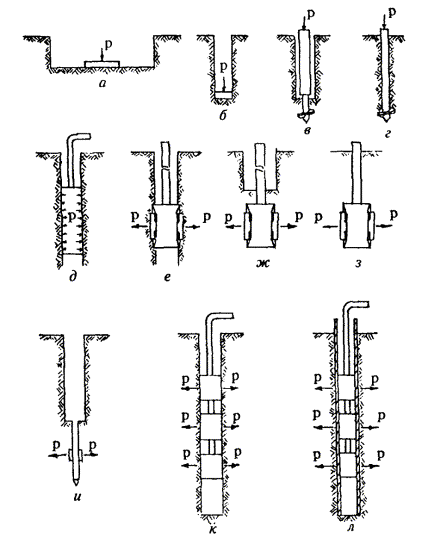 где D - диаметр кольцевой поверхности среза, см, определяемый по формуле D = D0 + 2m, (12.9) где D0 - диаметр скважины после предварительного уплотнения грунта, см; m - рабочая ширина лопасти, см; Н - высота распорного штампа. 12.4.4.3 Угол внутреннего трения j и удельное сцепление с определяют по графику t = f(p), построенному по результатам не менее чем трех испытаний грунта кольцевым срезом по 11.7.2, 11.7.3. ПРИЛОЖЕНИЕ А(справочное) Схемы испытаний грунта для определения характеристик деформируемости