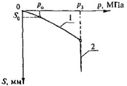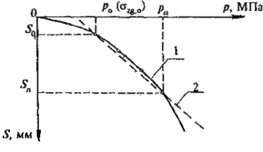 1 - линейная часть графика; 2 - осредняющая прямая График S = f(р) испытания штампом просадочного грунта с замачиванием Масштаб графика: по горизонтали: 40 мм - 0,1 МПа для р; по вертикали: 2 или 4 мм - 1 мм для S. По схеме «одной кривой»