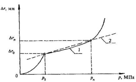6.5 Обработка результатов 6.5.1 По данным испытаний строят график зависимости перемещения стенки скважины от давления Dr = f(р) (приложение Ж). На графике проводят осредняющую прямую методом наименьших квадратов или графическим методом. За начальные значения р0 и Dr0 (первая точка, включаемая в осреднение) принимают значения р и Dr, соответствующие моменту полного обжатия неровностей стенок скважины - началу линейного участка графика. За конечные значения рn и Drn (предел пропорциональности) принимают значения Dр и Dr, соответствующие точке, ограничивающей линейный участок графика. 6.5.2 Модуль деформации грунта Е, МПа, вычисляют для линейного участка графика Dr = f(p) по формуле