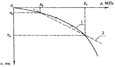 1 - линейная часть графика; 2 - осредняющая прямая ПРИЛОЖЕНИЕ И(рекомендуемое) Образец графического оформления результатов испытания грунта лопастным прессиометромГрафик u = f(p) Масштаб графика: по горизонтали: 40 мм - 0,1 МПа для р; по вертикали: 10 мм - 1 мм для u.