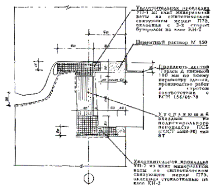 Рис. 9. Акустический шов по периметру верхней плиты шахты лифта для ее виброизоляции от ограждающих конструкций 6.4. При устройстве полов должны соблюдаться технологические требования "Инструкции по устройству различных типов полов в жилых и общественных зданиях" /8/. 6.5. Полы из ненесущих паркетных досок ПД 1 и ПД 3 (ГОСТ 862.3-86) /9/ щитов ПЩ-3 и ПЩ-4 (ГОСТ 862.4-87) /10/ и штучного паркета (ГОСТ 862-1-85) /II/ должны настилаться по упругому основанию из мягких ДПВ плотностью 150-250 кг/м3. Под штучный паркет, кроме того, необходимо укладывать слой полутвердых или твердых ДВП толщиной 4-6 мм для обеспечения несущей способности пола. 6.6. Мягкие ДВП под паркетные доски (ПД 1 м ПД 3), щиты (ПЩ-3 и ПЩ-4) и штучный паркет укладывают сплошным слоем, насухо, плотно стыкуя, их друг с другом, а также со стенами, и не допуская незаполненных мест. ДВП, применяемые для устройства звукоизоляционных прокладок под полы, должны транспортироваться и храниться в условиях, не допускающих их увлажнения и повреждения. Влажность прокладок из ДВП, укладываемых под чистый пол, должна быть не более 12%. 6.7. Несущие паркетные доски ПД-2 (ГОСТ 862.3-86), доски для полов (ГОСТ 8242-88) и несущие паркетные щиты ПЩ-1 и ПЩ-2 (ГОСТ 862.4-87) можно настилать по лагам шириной 80-100 мм, толщиной 40 мм. В качестве звукоизолирующих прокладок под лаги необходимо укладывать полосы мягких ДВП (ГОСТ 4598-85) шириной 100-150 мм, непосредственно по перекрытию. После укладки звукоизоляционных прокладок, их необходимо защищать от увлажнения, засорения и механических повреждений. Гвозди, которыми крепится чистый пол к лагам, не должны проходить сквозь звукоизоляционную прокладку, а звукоизоляционные прокладки, в свою очередь, запрещается прибивать гвоздями к лагам. Примечание. Щиты, нижний слой которых выполнен из древесностружечных плит экструзионного прессования, укладывать по лагам не разрешается. 6.8. Для стыкования паркетных досок и щитов при настилании пола по его периметру должны ставиться деревянные клинья на расстоянии 50-60 см друг от друга, которые образуют зазор шириной 12-15 мм между полом и стенами. После удаления клиньев зазор должен быть сохранен как акустический шов, для чего вместо клиньев необходимо вставить полоски из мягких ДВП. 6.9. При креплении плинтусов необходимо устанавливать упругие прокладки. Если плинтусы крепят к стене, то упругие прокладки следует устанавливать между плинтусом и полом, а если плинтусы крепят к полу - между плинтусом и стеной. В качестве упругих прокладок рекомендуется применять полоски теплозвукоизолирующего линолеума (ГОСТ 18108-86) /12/ размером 8´50 мм. Полоски линолеума следует приклеивать к плинтусу на расстоянии 800...1000 мм друг от друга на вододисперсионных клеях. Приложение 1