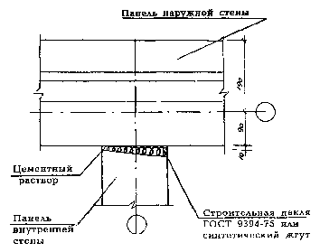 Рис. 4. Замоноличенный вертикальный стык между панелями наружных и внутренних стен В другом варианте заделки вертикальных стыков наружных стеновых панелей в качестве заполнителя используется пенопласт ФРП-1, которым по методу заливки исходной композиции заполняется (поэтажно) вся полость вертикального стыка в соответствии с требованиями ВСН 17-94 /б/. Степень заполнения стыка ФРП-1 определяется после его распалубки. Пенопласт должен заполнять весь объем стыка. В случае если заполнение неполное, следует вскрыть и ликвидировать причины некачественного заполнения стыка и этот участок заделать повторно. После удаления специальной опалубки в виде жгута из вспененного полиэтилена Вилатерм-С "опалубочные" полости вдоль стыка заделываются цементно-песчаным раствором снизу доверху на глубину до пенопласта. 3.8. Закрытые стыки (рис. 5) между внутренней и наружной стенами заделываются аналогично стыкам между панелями внутренних стен (см. п. 3.5). 3.9. Верхний горизонтальный и вертикальные стыки по периметру межкомнатных перегородок необходимо проконопачивать смоченной в гипсовом растворе паклей или синтетическим жгутом и оштукатурить раствором с обеих сторон на глубину не менее 20 мм (рис. 6). Нижний горизонтальный стык, а также трещины и щели необходимо оштукатурить цементным раствором с обеих сторон. 3.10. Для обеспечения звукоизоляции внутренних стен и перегородок с дверью просвет между дверным полотном и полом должен быть не более 10 мм. Стык между коробкой дверного проема и откосом панели должен быть тщательно заделан строительной паклей, синтетическим жгутом или другим материалом, согласованным для применения. Наличники, закрывающие стык, должны плотно прилегать к дверной коробке и телу внутренней стены перекрытия их. 3.11. Требуемая звукоизоляция балконных дверей и окон обеспечивается соблюдением технологии заделки стыков по контуру дверных и оконных блоков наружных стеновых панелей. Полость стыка плотно заполняется на глубину не менее 50 мм строительной паклей или прокладкой Вилатерм-СП Æ 30 мм, а остальная часть полости стыка синтетическим жгутом. После заделки стыка устанавливается наличник, который плотно прилегает к поверхности дверной (или оконной) коробки и откоса панели:
