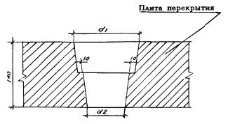 Рис. 6. Горизонтальный стык межкомнатных перегородок 4. ЗАДЕЛКА ТЕХНОЛОГИЧЕСКИХ ОТВЕРСТИЙ В ПАНЕЛЯХ МЕЖДУЭТАЖНЫХ ПЕРЕКРЫТИЙ И ВНУТРЕННИХ СТЕН4.1. Технологические отверстия в панелях междуэтажных перекрытий не должны ослаблять звукоизоляцию перекрытий. Перед заделкой засоренные отверстия необходимо очистить от мусора и других наслоений. Цементно-песчаная пробка должна плотно прилегать к поверхности отверстия, обеспечивая его герметичность, воздухонепроницаемость. Для заделки отверстий следует применять безусадочный цементный раствор марки 150. 4.2. Для улучшения звукоизоляции перекрытий технологические отверстия необходимо делать с уступом (рис. 7), чтобы в случае образования усадочной трещины по периметру отверстия звукоизоляция существенно не ухудшалась. Конфигурация отверстия для пропуска отопительных труб через междуэтажные перекрытия, независимо от того является она в плане круглой (усеченный конус) или прямоугольной, должна иметь по середине уступ шириной 10 мм аналогично технологическим отверстиям, показанным на рис. 7.