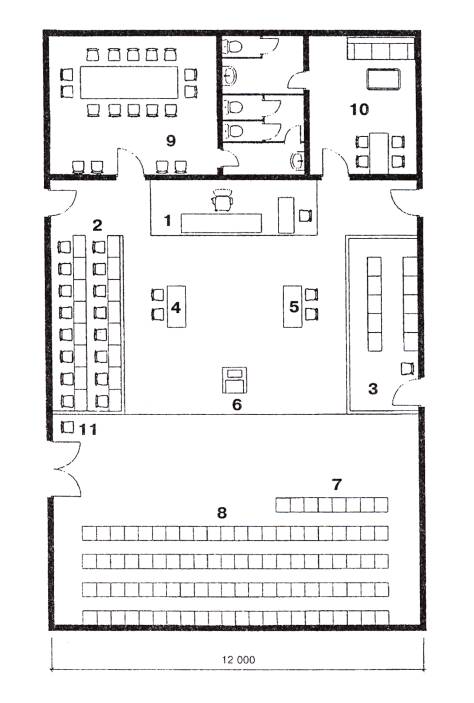 Рабочие помещения для технического аппарата суда 5.22* Рабочие помещения для технического аппарата суда включают: отдел делопроизводства, комнаты судебных приставов по обеспечению установленного порядка деятельности судов, кабинеты начальника отдела делопроизводства, старшего судебного пристава, администратора суда, помещения для архивов, экспедиции и машбюро, кабинет кодификации (библиотеку юридической литературы), кабинет консультанта-кодификатора, а также кладовые для хранения вещественных доказательств, для арестованного оружия и имущества. 5.23* Помещения для отдела делопроизводства рекомендуется размещать в едином блоке на первом этаже здания суда. В судах с числом судей 4 и более следует предусматривать единые помещения для отдела делопроизводства по уголовным и гражданским делам. Площадь помещения для отдела делопроизводства следует принимать из расчета 8 м2 на одного сотрудника. При оснащении рабочих мест компьютерами или другим крупногабаритным оборудованием площадь помещений допускается увеличивать в соответствии с техническими условиями на эксплуатацию этого оборудования. 5.24* В помещении для отдела делопроизводства должно быть предусмотрено место для приема посетителей. Оно отделяется барьером. В помещении канцелярии следует предусматривать одно-два рабочих места для адвокатов (для ознакомления их с материалами судебных дел, находящихся в отделе делопроизводства). Возможны варианты планировки, когда прием посетителей сотрудниками отдела делопроизводства (секретарями суда) осуществляется через окно, расположенное в стене, смежной со специальным холлом для посетителей. 5.25* В судах с числом судей 11 и более рекомендуется предусматривать отдельные помещения для ознакомления с делами прокуроров и адвокатов. Желательно размещать их смежно с отделом делопроизводства, предусматривая их сообщение через окно, однако при наличии в суде специальной должности секретаря (делопроизводителя) эти помещения могут размещаться в других местах на первом этаже здания. 5.26 Комнаты судебных приставов по обеспечению установленного порядка деятельности судов рекомендуется предусматривать на одно-два рабочих места, площадью не менее 10 м2 на одного судебного пристава. 5.27* Кабинеты начальника отдела делопроизводства, администратора суда и старшего судебного пристава по обеспечению установленного порядка деятельности судов должны иметь площадь 15-18 м2. 5.28* Для архивов в зданиях судов следует предусматривать отдельные помещения: - для архива текущих дел - из расчета 4 м2 на одного судью, но не менее 9 м2; - для архива оконченных производством дел - из расчета 6 м2 на одного судью на первом этаже здания суда. 5.29 Помещение для экспедиции следует предусматривать в судах с 4 судьями и более. Ее площадь назначается из расчета 6 м2 на работающего в комнате, но не менее 12 м2. Пункт 5.30 исключен. 5.31 Рекомендуется предусматривать отдельные помещения для множительной техники и компьютеров с площадью, определяемой в соответствии с техническими условиями на эксплуатацию этой техники, но не менее 12 м2. 5.32 Площадь кладовой вещественных доказательств определяется в задании на проектирование в зависимости от числа залов судебных заседаний по слушанию уголовных дел, но должна составлять не менее 18 м2. 5.33 Площадь кладовой для хранения имущес