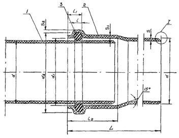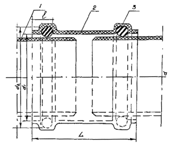 Рис. 3б. Соединение канализационных труб из ПВХ на муфте из ПВХ с уплотнением резиновыми кольцами круглого сечения: 1-труба из ПВХ; 2-муфта из ПВХ; 3-резиновое кольцо 2.10. Муфты из ПВХ изготавливаются НПО "Пластик" по ТУ 6-49-33-92. Размеры муфты из ПВХ приведены в табл. 7. Таблица 7 Размеры (мм) канализационных муфт из ПВХ