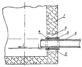 Рис. 4. Проход канализационного трубопровода сквозь стенки колодца и другие строительные конструкции: 1 - железобетонная стенка колодца; 2 - труба из ПВХ; 3 - муфта из ПВХ; 4 - резиновое кольцо; 5 - заделка цементным раствором Водопроводные сети 2.12. При проектировании наружных сетей водоснабжения из труб ПВХ в г. Москве следует применять трубы типа Т (Рраб=1,0 МПа). 2.13. Гидравлический расчет водопровода из ПВХ труб следует производить преимущественно по таблицам НМ-76-86 (часть 1) АО Моспроект и НИИМосстрой. 2.14. Глубина заложения сетей водопровода из труб ПВХ типа Т должна быть на 0,4-0,5 м больше расчетной глубины проникновения нулевой температуры. Минимальная глубина заложения водопровода из труб ПВХ типа Т (из условия прочности) должна составлять не менее 1,0 м. Максимальная глубина заложения в грунт труб из ПВХ типа Т не должна превышать 5,0 м. Примечание. При необходимости подземной укладки трубопроводов из ПВХ на глубину более 5 м следует производить проверочный расчет труб на прочность. 2.15. При параллельной прокладке водопроводов и канализации из труб ПВХ водопроводы из труб ПВХ следует проектировать, как правило, выше канализационных трубопроводов из ПВХ и других труб, при этом расстояние между ними должно составлять не менее 1,5 м. Примечание. Водопроводы из труб ПВХ можно размещать ниже трубопроводов канализации из ПВХ и других труб, при этом расстояние между ними свыше 1,5 м увеличивается на разницу в отметках заложения трубопроводов. 2.16. Водопроводы из труб ПВХ при пересечении с канализацией из ПВХ и других труб следует размещать выше на 0,4 м по вертикали в свету. 2.17. При пересечении водопроводов из труб ПВХ с газопроводами расстояние по вертикали в свету должно составлять не менее 0,2 м. 2.18. Водопроводы из труб ПВХ при пересечении с железными и автомобильными дорогами, с трамвайными путями следует прокладывать в футлярах. Длина концов футляра, выступающего за пределы пересекаемого сооружения, должна быть больше наружного диаметра трубы на 200 мм (при открытом способе производства работ). Зазор между трубой из ПВХ и футляром следует заполнять цементно-песчаным раствором марки 100. 2.19. Соединения раструбных напорных труб из ПВХ должны уплотняться резиновыми кольцами профильного сечения (рис.5).