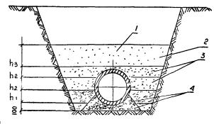 Трубы из ПВХ при отрицательных температурах имеют повышенную хрупкость, что требует соблюдения особых мер предосторожности при погрузочно-разгрузочных работах. 3.7. Соединительные канализационные муфты из ПВХ поставляются на склады и объекты монтажа в контейнерах. Раструбные отводы для напорных труб из ПВХ должны поставляться в отдельной упаковке и храниться в помещении. 4. МОНТАЖ ТРУБОПРОВОДОВЗемляные работы 4.1. Земляные работы при строительстве внутриквартальных сетей водоснабжения и канализации из труб ПВХ, крепление стенок траншей, водоотлив и водопонижение следует производить в соответствии с требованиями главы СНиП 3.02.01-87. 4.2. Ширина траншеи по дну должна быть, как правило, не менее наружного диаметра трубы +50 см. При плотных и твердых грунтах на дне траншеи перед укладкой труб необходимо устраивать "постель" из насыпного грунта толщиной 10 см, не содержащего твердых комков крупностью более 20 мм, кирпича, камня, щебня и других твердых включений. Перед укладкой труб из ПВХ на искусственное (бетонное или железобетонное) основание требуется устройство песчаной постели толщиной до 10 см. 4.3. Под раструбы труб из ПВХ и соединительные муфты канализационных труб на дне траншеи по всей ее ширине устраивают приямки глубиной d2 + 30 см и длиной, равной удвоенной длине раструба (l2) или муфты. 4.4. При засыпке канализационного и напорного трубопроводов из ПВХ над верхом трубопровода обязательно устройство защитного слоя из песчаного или мягкого местного грунта толщиной не менее 30 см с допускаемым содержанием твердых частиц (комков) грунта крупностью не более 20 мм и не содержащего твердых включений (щебня, камней, кирпичей и т.д.). 4.5. Засыпку пазух траншеи в случае их уплотнения следует вести послойно толщиной 5 см для глинистого грунта и 10 см для песчаного грунта (рис. 6, зоны 2 и 3). Подбивка грунтом трубопровода из ПВХ (см. рис. 6, зона 4) производится ручным немеханизированным инструментом. 4.6. Слои грунта в пазух между стенками траншеи и трубопроводом из ПВХ уплотняются преимущественно ручной механической трамбовкой типа ИЭ-4505 или аналогичного типа. Уплотнение глинистого и песчаного грунтов в пазух трамбовкой ИЭ-4505 для достижения коэффициента уплотнения "К", приблизительно 0,93, производится за один проход (удар) трамбовки, равного приблизительно 0,95 - за два прохода (удара); более 0,95 -за три прохода (удара). 4.7.Уплотнение защитного слоя до указанных коэффициентов уплотнения рекомендуется проводить также механизированными ручными трамбовками типа ИЭ-4505. При этом производить уплотнение непосредственно над трубопроводом из ПВХ запрещается (рис. 6, зона 1).