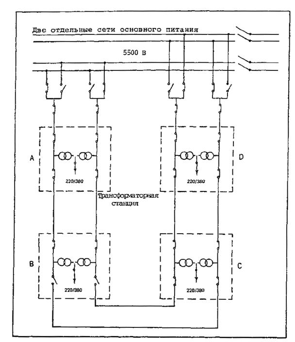 Рис. 2-3. Типовая конфигурация резервного дублированного непрерываемого источника питания 2.4.2 Расположение2.4.2.1 Сводчатые укрытия для электрооборудования не должны располагаться в тех местах, где они могут нарушить поверхности ограничения препятствий. Расстояния от аэродромного диспетчерского пункта до сводчатых укрытий должны быть достаточно малыми с целью избежания чрезмерного падения напряжения в кабелях управления. Допустимая длина этих кабелей изменяется в зависимости от сечения кабеля, напряжения, управления и типов используемых реле управления, но в некоторых более протяженных системах управления длина кабелей управления составляет более 2250 м. К сводчатым укрытиям необходим доступ транспорта при всех погодных условиях и желательно в периоды минимального движения воздушных судов. Расположение должно быть удобным, для подключения соответствующих сетей светотехнического оборудования и средств, чтобы по возможности обеспечить наименьшую длину питающих кабелей. Сводчатые укрытия должны быть изолированы от других зданий и средств с целью предотвращения распространения пожаров или взрывов, за исключением укрытий для установок резервных двигателей-генераторов, которые могут размещаться рядом со сводчатым укрытием для электрического оборудования с целью сокращения длины и размеров кабеля и для упрощения системы переключения питания. Для аэродромов с системами огней подхода могут потребоваться отдельные сводчатые укрытия оборудования огней подхода для каждой системы огней подхода. На крупных аэродромах ряд полномочных органов использует сводчатое укрытие рядом с каждым концом ВПП или системой огней подхода, чтобы обеспечить более легкое расположение цепей светотехнического оборудования и улучшения целостности систем. 2.4.3 Специальные условия2.4.3.1 В качестве сооружений специального назначения сводчатые укрытия для электрического оборудования могут потребовать определенных особенностей конструкции для обеспечения безопасности и надежной работы оборудования. Некоторые из этих особенностей: a) Вентиляция. Обеспечьте соответствующую вентиляцию для предотвращения повышения температуры трансформаторов до величин, превышающих предписанные изготовителем значения. Большая часть электрических тепловых потерь должна удаляться с помощью вентиляции; только незначительная часть может рассеиваться стенками сводчатого укрытия. В некоторых сводах правил по электрическому оборудованию рекомендуется предусматривать 20 квадратных сантиметров чистой площади колосниковой решетки на киловольт-ампер мощности трансформатора. В местностях с температурой выше средних значений, например, в тропических или субтропических районах, площадь колосниковой решетки должна быть увеличена или дополнена принудительной вентиляцией. b) Доступ. Должен предусматриваться соответствующий доступ для ремонта, технического обслуживания, установки и снятия оборудования. c) Дренаж. Для всех сводчатых укрытий должен предусматриваться дренаж. В тех случаях, когда обычный дренаж неосуществим, предусматривается отстойник, позволяющий использование портативного насоса. d) Безопасность. Каждое сводчатое укрытие для электрического оборудования должно снабжаться устройствами для предотвращения непреднамеренного или умышле