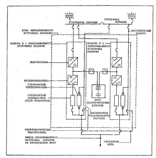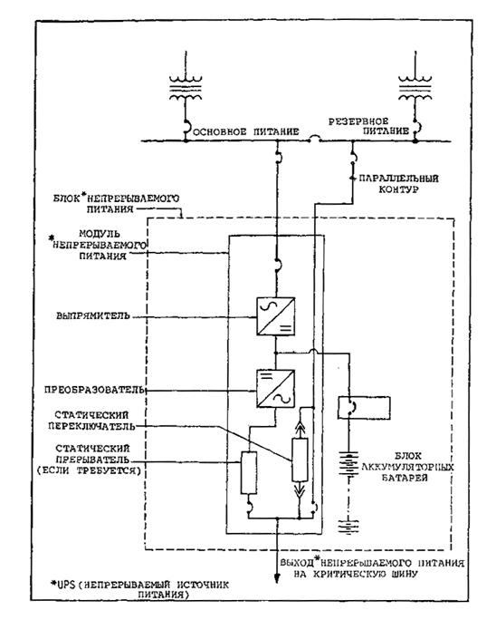 Рис. 2-2. Типовой нерезервированный источник непрерывного питания 2.3.2 Двигатели-генераторы2.3.2.1 Основная установка двигателя-генератора резервного питания состоит из первичного двигателя, генератора или генератора переменного тока, пускового устройства, органов управления запуском и топливного бака и устройства подачи питания. Установки двигателя-генератора для блоков резервного питания, как правило, имеют мощности от 100 до 500 киловольт-ампер, но могут иметь мощность в диапазоне от 50 до 1000 киловольт-ампер. а) Первичные двигатели. Первичными двигателями для большинства блоков резервного питания являются бензиновые, дизельные или газовые двигатели или турбины, выбор которых основывается на стоимости и наличии топлива. Как правило, эти первичные двигатели выпускаются в соответствии со стандартными размерами с достаточной мощностью для управления характеристикой генератора в киловольтах-амперах. Первичные двигатели для большинства крупных аэродромов соответствуют типам с быстрым запуском, которые могут запускаться автоматически, стабилизировать обороты и подключаться к нагрузке в течение 10 секунд. b) Генераторы. Генератор, как правило, генератор переменного тока, механически связан с первичным двигателем и обеспечивает резервное электропитание при номинальных параметрах частоты, напряжения мощности блока резервного питания. Эти генераторы могут быть либо однофазными, либо трехфазными. Они должны обладать высокой эффективностью преобразования механической энергии в электрическую энергию. c) Пусковые устройства. В большинстве установок двигателя-генератора резервного питания используются блоки аккумуляторных батарей для хранения энергии в целях запуска. Вследствие нечастого использования, коротких эксплуатационных периодов, требований к высоким значениям пусковых токов и стоимости для запуска этих блоков наиболее часто используются аккумуляторные батареи свинцово-кислотного типа. Блок аккумуляторных батарей (часто группа аккумуляторных батарей соединена последовательно и (или) параллельно) должен обеспечивать напряжение и ток, необходимый для запуска двигателя в пределах оговоренного времени и при наиболее неблагоприятных условиях (обычно в условиях низкой температуры -7°), в которых предполагается работа блока резервного питания. Зарядное устройство аккумуляторной батареи с органом управления разрядными и зарядными токами постоянно подключается к электрическому питанию для поддержания аккумуляторных батарей в заряженном состоянии. Блок аккумуляторных батарей должен хорошо проветриваться для предотвращения накопления водородного газа и должен быть защищен от возникновения электрических дуг, искр или пламени, которые могут вызвать взрыв накопленного газа. Никелево-кадмиевые аккумуляторные батареи могут использоваться в тех случаях, когда специальные условия оправдывают их первоначальную высокую стоимость. Маховые колеса, баллоны со сжатым воздухом, устройства хранения энергии, отличные от аккумуляторных батарей для запуска двигателя используются нечасто вследствие ненадежности или факторов стоимости. d) Органы управления запуском. Органы управления установкой двигателя-генератора, как правило, обеспечивают автоматический запуск с датчиком отказа основного питания в качестве ча