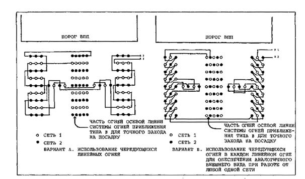 ВАРИАНТ В. ИСПОЛЬЗОВАНИЕ ЧЕРЕДУЮЩИХСЯ ОГНЕЙ В КАЖДОМ ЛИНЕЙНОМ ОГНЕ ДЛЯ ОБЕСПЕЧЕНИЯ АНАЛОГИЧНОГО ВНЕШНЕГО ВИДА ПРИ РАБОТЕ ОТ ЛЮБОЙ ОДНОЙ СЕТИ Рис. 3-3. Система огней приближения типа В для точного захода на посадку (система с линейными огнями в качестве осевой линии)