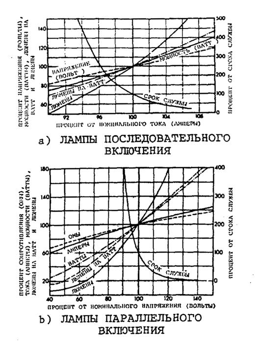 Рис. 3-8. Влияние изменения тока и напряжения на эксплуатационные характеристики ламп накаливания 3.5.1.4 Вольфрамово-галогеновые лампы. Многие из используемых в настоящее время для аэродромных огней ламп являются вольфрамово-галогеновыми. В таких лампах нить накала размещается в небольших кварцевых трубках, которые помимо обычного наполнителя в виде инертного газа содержат небольшое количество галогена, например, йода. При нагревании нити накала из нее происходит испарение вольфрама, который конденсируется на внутренней поверхности колбы лампы. Парообразный галоген смешивается с кондесированным вольфрамом и образует пар. Такой пар перемещается к горячей нити накаливания, где он разлагается и переносит вольфрам на нить накаливания. Данный процесс уменьшает затемнение колбы лампы, увеличивает ее срок службы, поддерживает высокое значение силы света и улучшает эффективность лампы. Однако стоимость лампы возрастает. 3.5.2 Характеристики газоразрядных ламп3.5.2.1 Лампы для бегущих огней приближения ("стробоскопические лампы"). Для бегущих огней приближения используются газовые лампы с конденсаторным разрядом, а не лампы накаливания. Такая лампа состоит из трубки, которая может иметь различную форму, и содержит инертный газ, например, аргон или криптон, который излучает свет при создании в нем электрической дуги. Подаваемое электропитание заряжает электрические конденсаторы, которые обеспечивают необходимую для дуги мощность, и создает напряжение для включения дуги при подаче соответствующего сигнала. Газовая дуга создает высокоинтенсивную вспышку света малой продолжительности (микросекунды), которая быстро потребляет заряд конденсаторов и приводит к затуханию дуги. Для подачи электроэнергии и питания ламп используется очень высокое напряжение. Необходимо учитывать его опасность при проектировании системы огней. Пиковая интенсивность таких огней может быть очень велика при малой продолжительности. Для определения эффективной силы излучаемого света и эффективности огней в качестве визуального средства необходимо интегрирование вспышек. Частота вспышек этих огней ограничена временем, которое необходимо для перезарядки конденсаторов, и составляющим обычно всего несколько циклов в одну секунду. Излучаемая мощность огня пропорциональна квадрату напряжения, которое приложено к его контактам, за исключением тех случаев, когда они имеют регулируемую подачу электроэнергии. 3.5.2.2 Другие виды газоразрядных ламп. Использованию газоразрядных ламп способствует их более высокая эффективность. К типам таких ламп относятся флуоресцентные, ртутные, металлогалоидные и натриево-паровые, работающие при низком и высоком давлении. Использование огней данного типа обычно ограничено освещением таких зон, как перрон, за исключением использования флуоресцентных ламп в качестве огней некоторых РД и для освещения знаков. При оценке использования огней данных типов необходимо рассмотреть следующие факторы: a) Повторное включение. Некоторые из данных ламп не могут быть повторно включены в течение периода от нескольких секунд до нескольких минут после затухания дуги. Перерывы в подаче электроэнергии или ее отключение могут вызвать выключение огней в ответственный момент. Может быть желательным наличие аварийных огней с друг