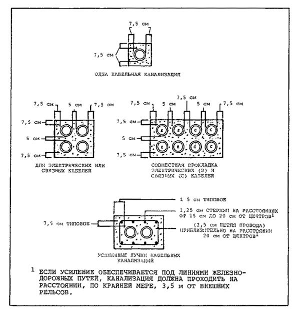 Рис. 4-1. Варианты линий кабельных канализаций 4.4.2 Расположение4.4.2.1 Смотровые колодцы или смотровые окна следует располагать там, где требуется обеспечить соединение или разветвление и где необходимо избежать повреждения других средств. Расстояние между смотровыми колодцами не должно превышать 200 м на прямолинейных участках и 100 м на закруглениях кабельной канализации. Там, где необходимо избежать повреждения кабеля в процессе его протягивания, необходимо уменьшить расстояние между колодцами. В процессе прокладки натяжение кабеля должно быть ограничено значением, при котором изоляция кабеля не будет нарушена или поврежден сам кабель (см. таблицу 4-1). 4.4.3 Шлейфы4.4.3.1 Хорошей практикой является обеспечение двух или более свободных шлейфов (короткие отрезки кабельной канализации, ведущей от смотрового колодца) для того, чтобы не повредить стенки смотровых колодцев при проведении строительства в будущем, шлейфы следует организовывать с обоих концов. 4.4.4 Оборудование4.4.4.1 Следует выбрать оборудование, необходимое при укладке кабеля. Если предусматриваются расширяющиеся концы кабельных канализаций, защитные устройства кабельных канализаций необходимы только для защиты кабелей в металлической оплетке. 4.4.5 Двухсекционные смотровые колодцы4.4.5.1 Двухсекционные смотровые колодцы следует использовать для обеспечения разделительных расстояний для цепей, где линии электроснабжения и связи прокладываются в одном пучке кабельных канализаций или для них используется тот же смотровой колодец. 4.5 ПРОКЛАДКА ПОДЗЕМНЫХ КАБЕЛЕЙ4.5.1 Подготовка кабельных канализаций4.5.1.1 После того, как устройство кабельной канализации закончено, кабели прокладываются путем затягивания или протаскивания в кабельные канализации. Перед протяжкой кабеля кабельная канализация должна быть открытой, сплошной и свободной от мусора. Кабель следует протягивать таким образом, чтобы предотвратить вредное растяжение проводников, повреждение изоляции или внешней защитной оболочки. Перед протяжкой концы всех кабелей следует обернуть влагозащитной лентой и оставить их закрытыми этой пленкой до момента соединения кабелей. Если в кабельной канализации должны прокладываться несколько кабелей, все кабели прокладываются одновременно. Разветвления или соединения кабелей ни при каких условиях не должны организовываться в кабелепроводе. 4.5.2 Протягивание кабеля в кабельных канализациях4.5.2.1 Метод протягивания. Кабель, который должен быть проложен в кабельной канализации может протягиваться с помощью лебедок с механическим приводом либо вручную. При протягивании следует использовать соответствующее количество компаундных материалов, предназначенных для протягивания кабеля. Не следует использовать нефтяное масло. Поверхность оплетки кабеля или рубашки не должна быть повреждена на глубину более 1/10 его первоначальной толщины. Кабель не должен быть сплющенным более чем на 1/10 внешнего диаметра. Максимальные значения натяжения при протягивании кабеля для традиционно используемых кабелей приведены в таблице 4-1. Пределы, указанные в таблице 4-1, не запрещают использование для протягивания стальных или проволочных троссов. Если для измерения соответствующего натяжения протягиваемого кабеля не применяются динамометры, следует использовать приемлемый разме
