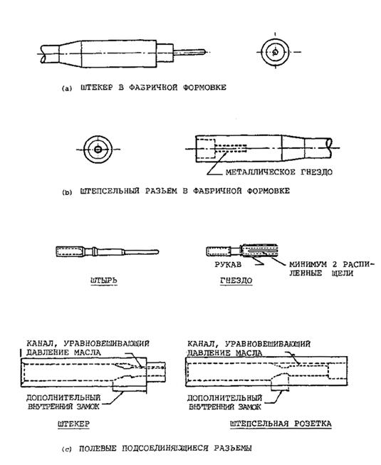 Рис. 5-1. Сращивание одножильного кабеля с использованием изоляционной ленты 5.2.2.7 Продолжайте обматывать резиновой изоляцией, как описано в п. 5.2.2.5, до размеров не менее 1,5 диаметра кабеля. Аккуратно прикладывайте усилия к изоляционной ленте для того, чтобы избежать пустот и обеспечить хорошее прилегание к поверхности кабеля и слоев изоляционной ленты между собой. 5.2.2.8 Поверх резиновой изоляционной ленты добавьте несколько слоев высокопрочной изоляционной, негорючей, устойчивой против атмосферных влияний пленки. Накладывайте пластиковую ленту с разумным натяжением, и чтобы каждый раз она перекрывала примерно 50 процентов ее ширины. Пластиковая лента должна проходить на 3 см или более вдоль поверхности изоляции экрана с каждой стороны места сращивания. 5.2.2.9 Если кабель имеет стальную оболочку или другие металлические покрытия, соедините заземляющую оплетку по всей длине сращивания и подсоедините к защитной оболочке кабеля соответствующими хомутами и (или) с помощью припоя с каждой стороны места сращивания (см. рис. 5-2а). Если кабель покрыт свинцовой оболочкой, обеспечьте соответствующее герметизирующее свинцовое соединение поверх места сращивания для обеспечения водонепроницаемого покрытия свинцовой оболочки кабеля. Если металлическое покрытие защищено от коррозии с помощью специального покрытия, применяйте материал аналогичный используемому по всей длине кабеля и в зоне места проведения работ по сращиванию. 5.2.3 Набор соединителей для аэродромного светосигнального оборудования5.2.3.1 Использование набора соединителей. В последние годы большинство соединений последовательных цепей осуществлялось с помощью наборов соединителей. Хотя стоимость наборов соединителей является значительной, экономия времени при прокладке и упрощение разделки цепей и заделки их при обнаружении неисправностей делают применение их желательным. Поскольку выводы большинства изолирующих трансформаторов в настоящее время снабжаются соединителями, необходимы соединители кабеля и они дают возможность обеспечить легкое подсоединение или отключение трансформаторов в последовательную цепь и к огням. Одножильные соединители показаны на рис. 5-3. 5.2.3.2 Установка соединителей. Концы кабеля должны быть подготовлены тщательным образом в соответствии с инструкциями, предохраняя тем самым оба конца кабеля и поверхности проводников от попадания грязи и влаги. Убедитесь, что любые зазоры между кабелем и внешним слоем проводника заполнены соответствующей массой, предотвращающей образование пустот. После соединения проводников убедитесь в том, что отсутствует попадание воздуха, предотвращая тем самым возможность рассоединения проводников. Рекомендуется обмотать место соединения виниловой электроизоляционной лентой для предохранения от попадания в данную зону грязи и предотвращения рассоединения. 5.2.4 Коаксиальные кабели5.2.4.1 Негерметичные коаксиальные кабели. Коаксиальные кабели следует соединять используя соответствующие коаксиальные соединители. Каждый соединитель должен быть минимум на 15 см закрыт термостойким сжимающимся кожухом, имеющим коэффициент усадки 3:1 или более. Перед закрытием самоуплотняющимся кожухом, кабель может быть покрыт соответствующим клеющим слоем. Для нанесения термоуплотняющегося кожуха следует исполь