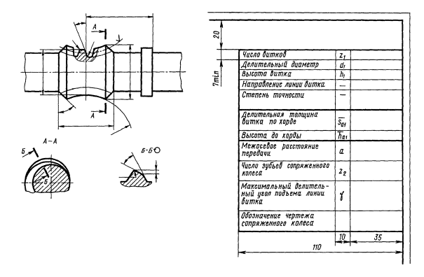 хорде высота до хорды зуба 12. В третьей части таблицы параметров зубчатого колеса должны быть приведены: а) межосевое расстояние передачи а; б) число витков сопряженного червяка z1; в) угол профиля зуба на делительном диаметре в средней плоскости колеса а; г) число зубьев сектора; д) при необходимости - прочие справочные данные, например, модуль; е) обозначение чертежа сопряженного червяка. 13. Неиспользуемые строки таблицы параметров следует исключать или прочеркивать. 14. Примеры указания параметров зубчатого венца на чертежах червяков и колес приведены на черт. 1 и 2. Пример указания параметров зубчатого венца на чертеже червяка глобоидной передачи Черт. 1 Пример указания параметров зубчатого венца на чертеже колеса глобоидной передачи Черт. 2 |