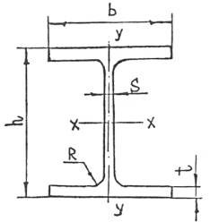 Чертеж 1 Условные обозначения: h - высота двутавра; b - ширина полки; t - толщина полки; S - толщина стенки; R - радиус сопряжения 3.3 Размеры двутавров, площадь поперечного сечения, масса одного метра длины профиля и справочные величины для осей (I - момент инерции, W - момент сопротивления, S - статический момент полусечения, i - радиус инерции) приведены в таблице 1. Таблица 1Размеры двутавров, площадь поперечного сечения, масса 1 м длины, справочные величины для осей Нормальные двутавры