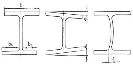 Чертеж 2 Условные обозначения: b1 - ширина удлиненного фланца; b2 - ширина укороченного фланца; D - перекос полки; f - прогиб стенки; Таблица 2 Предельные отклонения по размерам и форме поперечного сечения
