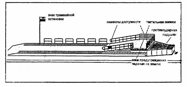 Мини-платформы на узловых городских остановках обеспечивают доступность поездов и трамваев. Для входа и выхода пассажиров используют либо откидной мостик над ступенями, закрепленный на боковой стенке вагона, либо переносной пандус, который устанавливается водителем и хранится в специальной нише позади водительского места. Размеры габаритов платформ см. в Выпуске 1 - раздел 10, п. 4.1. настоящего Пособия. 3.6. ПЛАТФОРМЫ НА ОСТАНОВКАХ РЕЛЬСОВОГО ТРАНСПОРТА