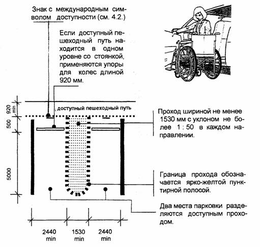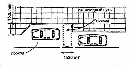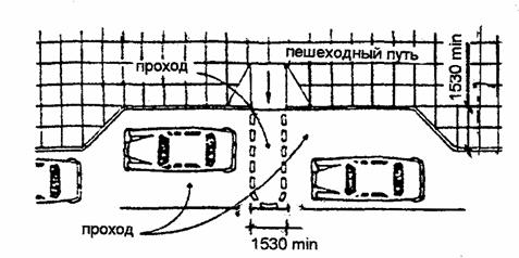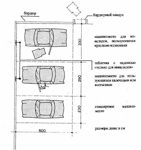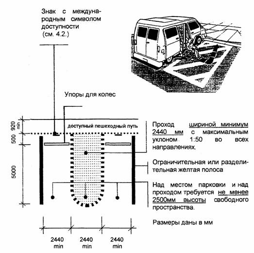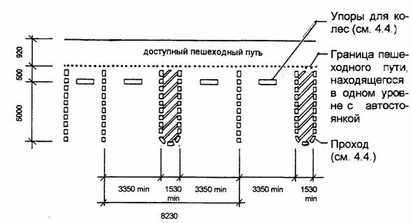 Универсальная стоянка для всех видов транспорта с боковой или задней дверью для посадки и высадки (легковые автомобили, вэны, автобусы). Размеры даны в мм. 4.4. СТОЯНКИ ДЛЯ ЛЕГКОВЫХ АВТОМОБИЛЕЙ [3]
