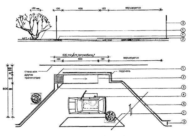 1. Изменение фактуры или цвета покрытия 2. Пандус 6% с боковыми бортиками 3. Знак с международным символом доступности 4. Рисунок знака на покрытии 5. Бордюрный камень Размеры даны в см 5.2. ВАРИАНТЫ ПОДЪЕЗДА АВТОМОБИЛЯ К ПЕШЕХОДНОМУ ПУТИ [5]