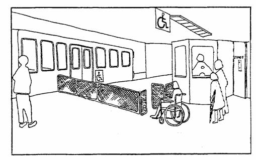 Пример выделения пространства для инвалидов у последней двери последнего вагона (около лифта). 7.6. ОБОРУДОВАНИЕ ВХОДА В ВАГОН [8]