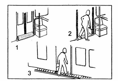 Примеры стационарных приспособлений для мягкого преодоления разницы отметок поверхности перрона и пола вагона и горизонтальной щели между ними: 1, 2 - сплошная полоса из резины, закрепленная на полу вагона и опирающаяся свободной стороной на закрытые полотна дверей; при открывании двери полоса опускается на пол перрона, накрывая щель, 3 - длинная полоска из отдельных резиновых клапанов, жестко прикрепленных к полу перрона и обращенных свободным концом к вагону; при открывании двери клапаны опускаются на пол вагона, перекрывая щель. 8. ЖЕЛЕЗНОДОРОЖНЫЕ ВАГОНЫ8.1. ПЛАНИРОВКА И ОБОРУДОВАНИЕ [5]