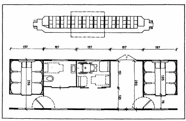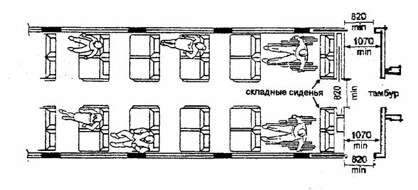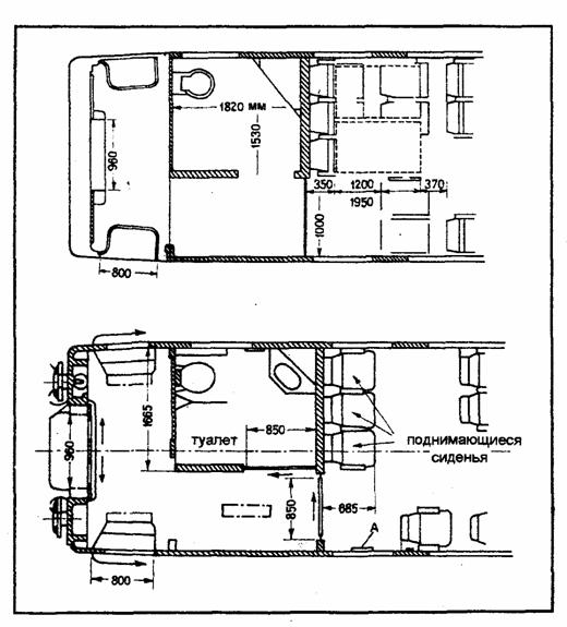 Вариант планировочного решения части вагона второго класса; приспособленной для инвалидов (немецкая железнодорожная колея). 8.5. ЗАРУБЕЖНЫЕ ПРИМЕРЫ ПЛАНИРОВКИ И ОБОРУДОВАНИЯ [8]