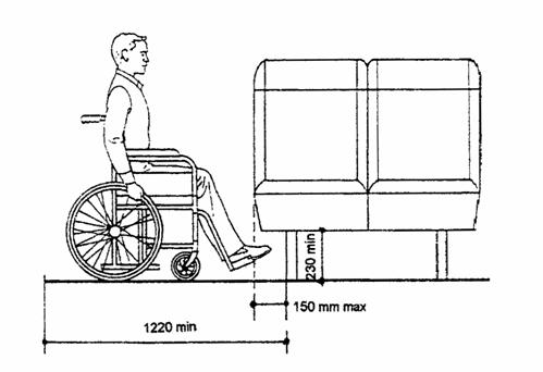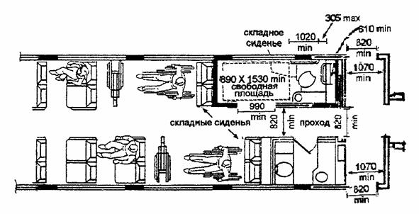 Габариты подходов к сиденью 9.2. ЗАРУБЕЖНЫЕ ПРИМЕРЫ МЕР БЕЗОПАСНОСТИ ДЛЯ ПАССАЖИРА В КРЕСЛЕ-КОЛЯСКЕ (ВАРИАНТ США) [9] Кресло-коляска ставится в салоне лицом вперед, закрепляется на месте при помощи ремней или блокировкой колес, пассажир также пристегивается ремнем.