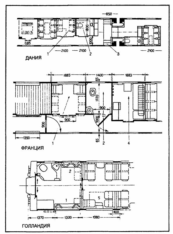 1 - купе для инвалидов, 2 - туалет для инвалидов, 3 - вход, оборудованный подъемником, 4 - служебное отделение, 5 - место для кресла-коляски. 8.4. ЗАРУБЕЖНЫЕ ПРИМЕРЫ ПЛАНИРОВКИ И ОБОРУДОВАНИЯ [8]