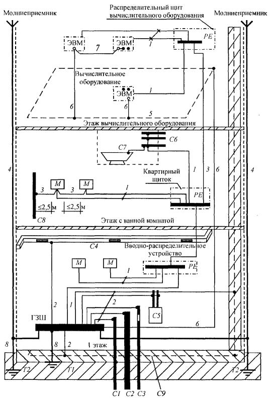 М - открытая проводящая часть; С1 - металлические трубы водопровода, входящие в здание; С2 - металлические трубы канализации, входящие в здание; С3 - металлические трубы газоснабжения с изолирующей вставкой на вводе, входящие в здание; С4 - воздуховоды вентиляции и кондиционирования; С5 - система отопления; С6 - металлические водопроводные трубы в ванной комнате; С7 - металлическая ванна; С8 - сторонняя проводящая часть в пределах досягаемости от открытых проводящих частей; С9 - арматура железобетонных конструкций; ГЗШ - главная заземляющая шина; Т1 - естественный заземлитель; Т2 - заземлитель молниезащиты (если имеется); 1 - нулевой защитный проводник; 2 - проводник основной системы уравнивания потенциалов; 3 - проводник дополнительной системы уравнивания потенциалов; 4 - токоотвод системы молниезащиты; 5 - контур (магистраль) рабочего заземления в помещении информационного вычислительного оборудования; 6 - проводник рабочего (функционального) заземления; 7 - проводник уравнивания потенциалов в системе рабочего (функционального) заземления; 8 - заземляющий проводник