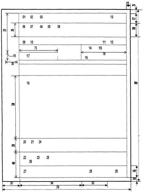и т.д. 3.23. Внутреннее согласование документа оформляют визой, которая включает подпись визирующего, расшифровку подписи (инициалы, фамилия) и дату, при необходимости - должность визирующего. Визы проставляются на последнем листе подлинника распорядительного документа, на копии отправляемого документа (письма). Возможно оформление виз распорядительного документа на отдельном листе. При наличии замечаний к документу визу оформляют следующим образом: Замечания прилагаются. Личная подпись В.Н. Шульц 12.08.99 3.24. Печать заверяет подлинность подписи должностного лица на документах, предусмотренных специальными нормативными актами, удостоверяющих права лиц, фиксирующих факты, связанные с финансовыми средствами. Документы заверяют печатью организации. 3.25. При заверении соответствия копии документа подлиннику ниже реквизита «Подпись» проставляют заверительную надпись «Верно», должность лица, заверившего копию, личную подпись, расшифровку подписи (инициалы, фамилию), дату заверения, например: Начальник Главгосэкспертизы России Личная подпись Ю.Б. Жуковский Верно Начальник сектора кадров Л.А. Лебедева Допускается копию документа заверять печатью, определяемой по усмотрению организации. 3.26. Отметка об исполнителе включает фамилию исполнителя документа и номер его телефона. Отметку об исполнителе располагают на лицевой или оборотной стороне последнего листа документа в левом нижнем углу, например: Станкевич 925-80-43 или Станкевич Владимир Иосифович 925-80-43 3.27. Отметка об исполнении документа делается в левом нижнем углу документа и включает краткие сведения об исполнении, если отсутствует документ, свидетельствующий об исполнении, или, при наличии такого документа, ссылку на его дату и номер, отметку «В дело», номер дела, в котором будет хранится документ, дату, подпись исполнителя документа, например: Исполнено. Письмо Главгосэкспертизы России от 12.07.99 №24-1-9/250 в адрес Минэкономики за подписью Жуковского. Дело 24-1-9. 15.07.99. личная подпись И.В. Савин 3.28. Отметка о поступлении документа в организацию содержит порядковый номер и дату поступления документа (при необходимости - часы и минуты). Допускается отметку о поступлении документа в организацию проставлять в виде штампа. 3.29. Отметка для автоматического поиска документа может включать имя файла, код оператора, а также другие поисковые данные, устанавливаемые в организации. Примеры оформления реквизитов документов приводятся в приложении 2. 4. Требования к бланкам документов и оформлению документов4.1. Документы изготавливают на бланках. ГОСТ Р 6.30-97 установлено два основных формата бланков документов -А4 и А5, допускается использование бланков форматов А3 и А6 по ГОСТ 9327. Бланки документов должны иметь поля не менее, мм 20 - левое; 10 - правое; 20 - верхнее; 10 - нижнее. 4.2. Бланки документов следует изготавливать на белой бумаге или бумаге светлых тонов. Бланки документов допускается изготавливать с помощью средств вычислительной техники непосредственно при изготовлении конкретного документа. Исключение составляют бланки организаций с изображением Государственного герба Российской Федерации или гербов субъектов Российской Федерации, порядок изготовления которых приведен в разделе 6 настоящего Порядка. 4.3. Бланки документов проектируют в соответствии с приложением 1. Сплошными линиями об