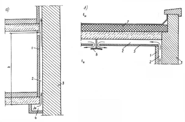 Приложение 5ВОЗДУШНАЯ ПАРОГИДРОИЗОЛЯЦИЯ ОГРАЖДАЮЩИХ КОНСТРУКЦИЙЭффективность и устройство воздушной парогидроизоляции Характерный для традиционных парогидроизоляционных покрытий (окрасочные, мастичные, обмазочные) является частые отказы и малая долговечность (теряют свои влагозащитные свойства в течение 3-12 лет). Своевременную замену многих из них осложняют необходимость удаления дорогостоящей отделки и прижимных стенок, прекращение эксплуатации помещения, невозможность контролировать техническое состояние покрытий из-за скрытого их расположения в конструкции. Воздушная парогидроизоляция (см. п. 54), выполненная в виде воздушной прослойки, расположенной у внутренней поверхности ограждающей конструкции и вентилируемой теплым и сухим воздухом системы вентиляции (воздушного отопления) здания, является надежным барьером на пути перемещения влаги из помещения в ограждение (рис. 1). Имея высокий дефицит влаги, воздух прослойки полностью ассимилирует то небольшое количество водяных паров, которое проникает через плотный малопаропроницаемый слой (экран), образующий прослойку, создает постоянный осушающий режим в ограждении, повышающий его теплозащитные свойства. Рис. 1. Схемы устройства воздушной парогидроизоляции а - стены; б - бесчердачной крыши; 1 - экран; 2 - воздушная вентилируемая прослойка стены; 3 - наружная стена; 4 - распределительный вентиляционный короб; 5 - подвесной потолок (Экран); 6 - отражатель воздушного потока; 7 - бесчердачная кровля Соответствующим подогревом воздуха прослойки можно предотвратить неизбежное во многих случаях выпадение конденсата на внутренних поверхностях ограждающих конструкций с традиционной парогидроизоляцией при повышенном температурно-влажностном режиме помещений. Следовательно, будет устранен один из интенсивных источников увлажнения ограждений - постоянное мокрое состояние их поверхностей, отекание конденсата на пол, включая окапливание помещения с потолка. Теплые поверхности конструкций исключают радиационное охлаждение тела человека, что очень важно для таких помещений как мыльные, душевые, раздевальни бань и т.п. Воздух прослойки одновременно выполняет влагозащитные функции для ограждающих конструкций и используется для вентиляции и отопления помещений. Применение воздушной парогидроизоляции открывает возможность широкому использованию эффективных теплоизоляционных материалов для возведения стен мокрорежимных помещений. Наличие с внутренней стороны таких ограждений сухого воздуха гарантирует их безотказное функционирование в течение всего заданного срока службы. Ограждающие конструкции с воздушной парогидроизоляцией позволяют размещать помещения с мокрым режимом непосредственно у наружных стен. Внутреннюю вентилируемую воздушную прослойку целесообразно рассматривать как дополнительный элемент ограждающих конструкций помещений с мокрым и влажным режимами. Это позволит возводить все соответствующие конструкции здания из однотипных изделий и лишь в пределах мокрорежимных помещений устраивать воздушную парогидроизоляцию. Возможно применение специальных панелей с каналами, расположенными у внутренней их поверхности, которые используются в здании для создания воздушной парогидроизоляции. Толщина вентилируемой воздушной прослойки определ