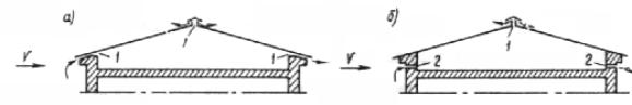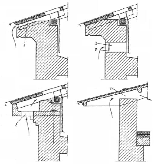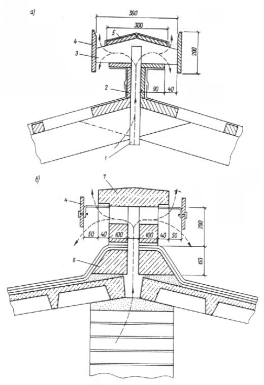 Так как Приложение 6ВЕНТИЛЯЦИОННЫЙ МЕТОД СНИЖЕНИЯ ИНТЕНСИВНОСТИ ОБЛЕДЕНЕНИЯ НАРУЖНЫХ ВОДООТВОДЯЩИХ УСТРОЙСТВ КРЫШОдним из существенных недостатков, снижающих эксплуатационные свойства крыш зданий, является обледенение их наружных водоотводящих устройств - желобов, свесов, водосточных труб. Скопление в них льда обусловливает неорганизованный водосток с крыши, сопровождающийся увлажнением и загрязнением фасадов, протекание кровель через сопряжения элементов, массовое разрушение водосточных труб, обрушение льда со свесов. Очистка крыш от снега и наледей требует значительных затрат труда и средств, часто приводит к повреждению кровли. Основная причина обледенения: в чердачных и вентилируемых бесчердачных крышах - наличие теплого воздуха (свыше +2 °С) в подкровельном пространстве в слабоморозные дни (до -12 °С) вследствие недостаточной его естественной вентиляции, в бесчердачных невентилируемых крышах - из-за смещения нулевой изотермы к поверхности кровли со снежным покровом. В таких крышах к тому же, как правило, наблюдаются обильные конденсационные процессы на внутренней поверхности чердачных и в толще теплоизоляции бесчердачных крыш. Исследования показывают, что традиционное проветривание чердачных помещений через жалюзийные решетки слуховых окон и устройств в бесчердачных крышах вентиляционных каналов небольшого сечения представляют собой неэффективные решения из-за нерационального размещения (в одном уровне и в области примерно равных аэродинамических коэффициентов - в чердачных крышах) и малой площади вентиляционных отверстий. Отложение инея в небольших по размеру каналах и воздушных прослойках малой высоты превращает бесчердачную вентилируемую крышу в невентилируемую со всеми присущими ей недостатками с дополнительным увлажнением теплоизоляции при таянии инея. Чтобы исключить таяние снега на крыше при отрицательных температурах наружного воздуха и последующего замерзания талой воды на надкарнизных холодных участках кровли необходимо обеспечить интенсивный естественный воздухообмен в ее подкровельном пространстве. Это может быть достигнуто рациональным размещением вентиляционных отверстий, площадь которых определяется расчетом. Чердачные крыши В чердачных крышах вентиляционные отверстия устраиваются в карнизной части стен непосредственно под свесом кровли и в коньке крыши (рис. 1). Примеры конструктивного решения вентиляционных отверстий даны на рис. 2, 3. Рис. 1. Схемы чердачных крыш с расположением вентиляционных отверстий: а - под свесом кровли и в коньке крыши; б - в карнизной части стены и в коньке крыши; 1 - щелевидной формы; 2 - прямоугольной формы Рис. 2. Примеры устройства в карнизных узлах чердачных крыш вентиляционных отверстий: 1 - щелевидной формы; 2 - прямоугольной формы; 3 - решетка Рис. 3. Примеры устройства оголовков над вентиляционным отверстием в коньке чердачной крыши: а - с деревянными несущими конструкциями; б - то же, с железобетонными; 1 - стойки из брусков; 2 - обшивка дощатая; 3 - кобылки; 4 - отражатель; 5 - кровля; 6 - основание подоголовок из бетонных камней; 7 - железобетонный оголовок из сборных элементов Площадь вентиляционных отверстий, м2, в карнизной части стен (нижних) на 1 м их длины определяется по формуле где В -