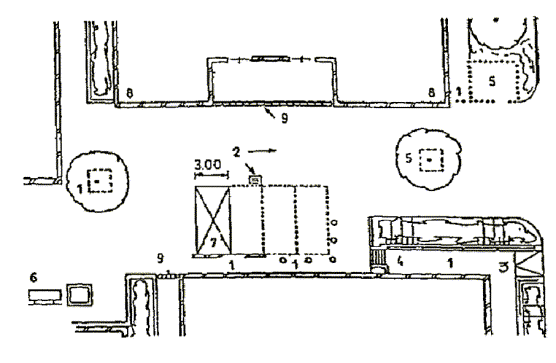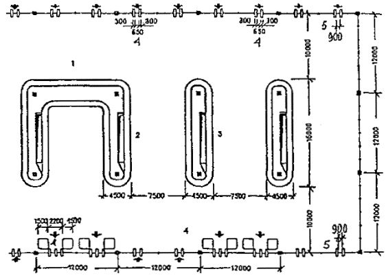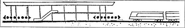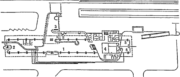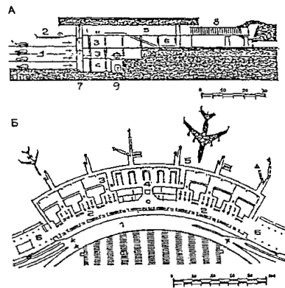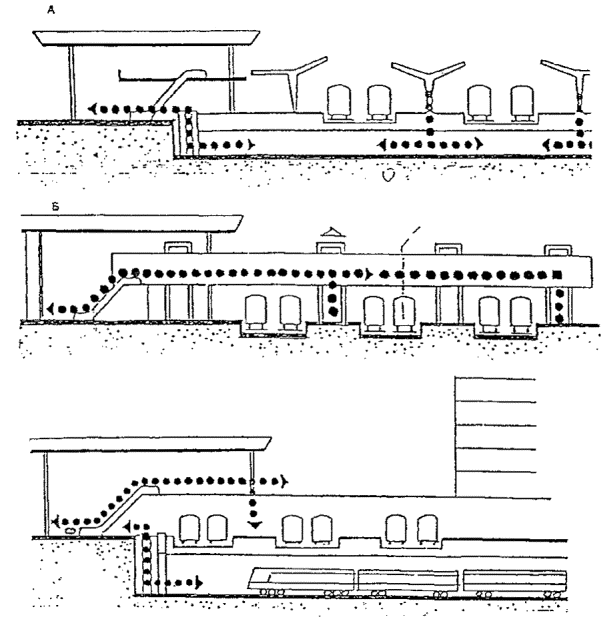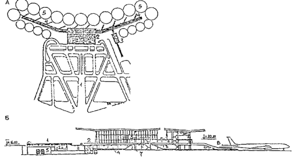 Черт. 46. Аэровокзальный комплекс А. Схема генерального плана: 1 - привокзальная площадь; 2 - здание аэровокзала; 3 - башня управления полетами; 4 - крытая галерея ближнего перрона; 5 - стоянки самолетов Б. Разрез: 1 - привокзальная площадь; 2 - основной пассажирский уровень (1-й этаж) здания аэровокзала; 3 - 2-й этаж с залом транзитных пассажиров, баром, рестораном и отелем; 4 - цокольный этаж; 5 - ввод рельсового транспорта под привокзальную площадь; 6 - ввод автотранспорта; 7 - эскалаторы; 8 - пандус В. План 1-го этажа: 1 - главный зал; 2 - таможня прибытия; 3 - таможня отправления; 4 - банк; 5 - служебные помещения; 6 - иммиграционная служба; 7 - полиция; 8 - почта-телеграф; 9 - багажный конвейер; 10 - эскалаторы; 11 - зал ожидания; 12 - крытая галерея Г. План цокольного этажа: 1 - почта-телеграф; 2 - вход персонала; 3 - телефонные кабины; 4, 5, 7, 9-11, 14 - служебные и технические помещения; 6 - бюро наземных служб; 8 - киоски; 12 - буфет; 13 - санузлы; 15 - багажный конвейер; 16 - ветровые ограждения от реактивных струй; 17 - пандусы; 18 - башня управления полетами · Многоуровневое решение второго аэровокзала в аэропорту Париж-Шарль де Голль позволяет разместить все транспортные службы (автостоянки, станцию транзитного транспорта) на нижних подземных этажах. · Прибытие пассажиров по подъездной рампе, полное пред- и послеполетное обслуживание, посадка в самолет производятся на верхнем уровне (2-й этаж здания аэровокзала). · Перемещение пассажиров между этажами производится лифтами. · Четкое горизонтальное и вертикальное зонирование исключает пересечение потоков пассажиров и сокращает пути их передвижения, что создает безбарьерную среду для инвалидов и маломобильных пассажиров (черт. 47). Черт. 47. Типовой аэровокзал А. Разрез типового аэровокзала: 1 - паркинг; 2 - подъездная рампа; 3 - технические помещения; 4 - станция транзитного транспорта; 5 - общий зал пассажиров; 6 - багажное помещение; 7 - лифтовая шахта; 8 - посадочный трап; 9 - ввод скоростного транспорта в здание аэровокзала Б. План 2-го этажа типового аэровокзала: 1 - подъездная рампа; 2 - зал регистрации пассажиров; 3 - зал ожидания; 4 - выдача багажа; 5 - распределительная галерея; 6 - помещения дополнительного обслуживания Рассредоточенное решение аэровокзального комплекса · Комплекс аэропорта Мюнхен-2 (ФРГ, 70-е гг., 2000 пас/ч) имеет четкое функциональное решение. Аэровокзал занимает островное положение в комплексе аэропорта. · Службы оформления полета, посадки и высадки из самолета рассредоточены в двух зданиях, состоящих из одинаковых секций и соединенных корпусом общих помещений. · Одноуровневая привокзальная площадь, разделенная главным корпусом на две части и занятая автостоянками, расположена в центре аэровокзального комплекса и опоясана эстакадой с односторонним движением, по которой пассажиры подвозятся к соответствующей секции. · Исключается пересечение потоков, пешеходные передвижения пассажиров сведены к минимуму, все основные операции, включая посадки, в самолет, производятся в одном уровне (черт. 48). Черт. 48. Генеральный план аэропорта и общий вид аэровокзального комплекса 1 - здание общих помещений; 2 - технологические здания аэровокзала; 3 - привокзальная площадь; 4 - перроны; 5 - подъездная автодорога; 6 - взлетно-посадочные полосы МЕТРОПОЛИТЕН· Пример полностью приспособленной станции метро надземного расположения - станция «Шенефельд»