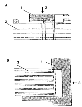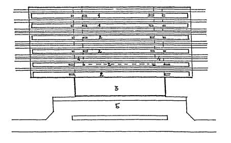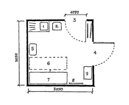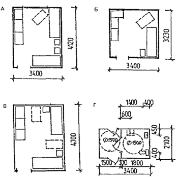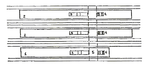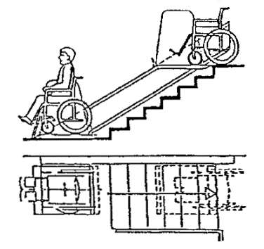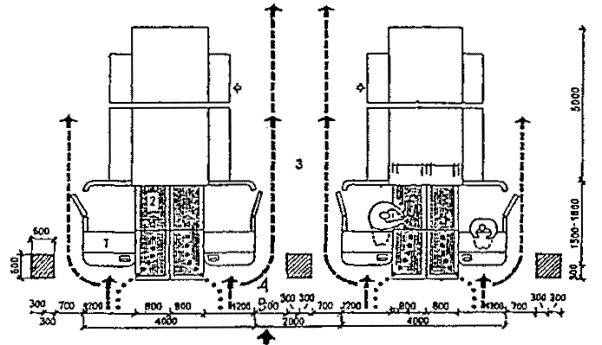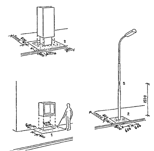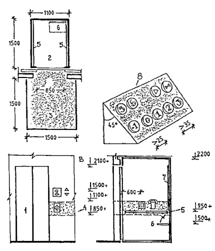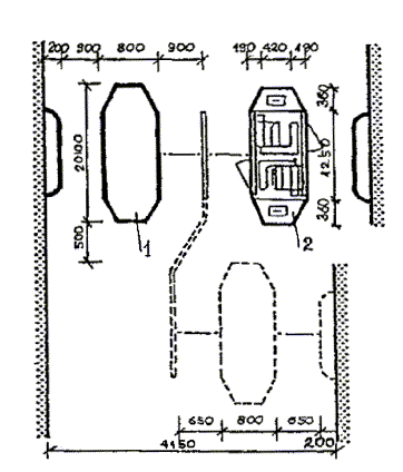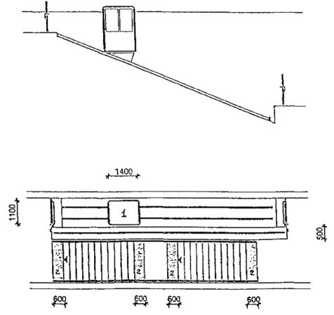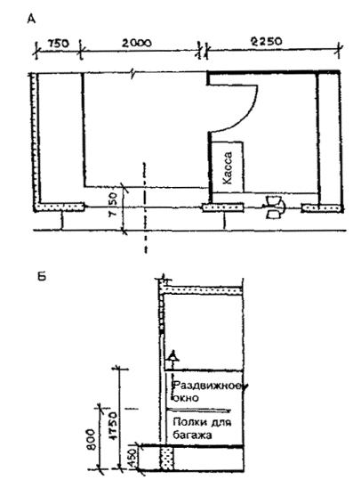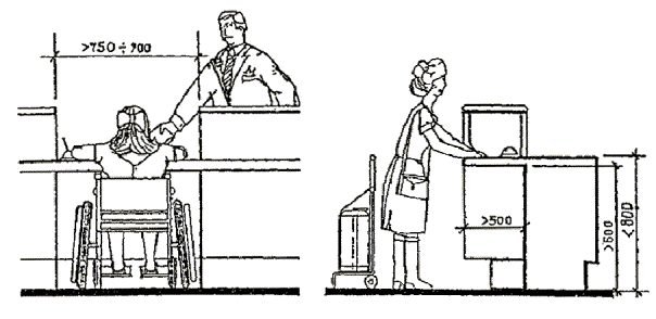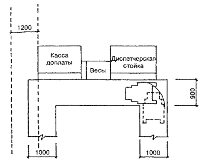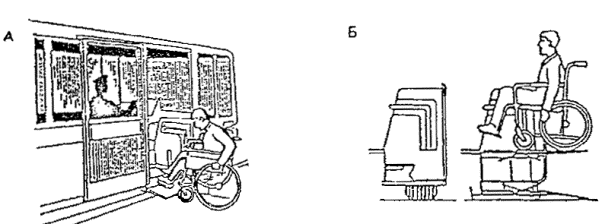 Черт. 27. Схема размещения оборудования в зонах паспортного и таможенного контроля Черт. 28. Фрагмент плана зоны выдачи багажа при подаче с нижележащего этажа 1 - зал выдачи багажа; 2, 3 - транспортеры; 4 - общие входы и выходы для пассажиров; 5 - проходы для инвалидов на колясках шириной 90 см ПЕРРОНЫ· Посадка в самолет и высадка производятся на ближнем или дальнем перроне. На ближнем перроне при посадке (высадке) с уровня 2-го этажа используются галереи и телетрапы, с уровня земли - приставные лестницы-трапы. · Уклон телетрапа или галереи для самостоятельно передвигающихся пассажиров на колясках и маломобильных пассажиров не должен превышать 1:12, при передвижении инвалидов с сопровождающими допускается уклон большей величины. В галерее через каждые 10 м следует предусмотреть горизонтальную площадку для отдыха размером не менее 1,5 ´ 1,5 м. · При посадке в самолет с уровня земли (высадке) для подъема или спуска инвалидов и маломобильных пассажиров следует предусмотреть специальное устройство - приставной механизированный трап-эскалатор или автолифт. · При доставке пассажиров к самолетам (и от них), размещенным на дальнем перроне, специальными автобусами или автопоездами с пониженным уровнем пола для посадки и высадки из них инвалидов и маломобильных пассажиров следует использовать откидной пандус. · На аэровокзалах рекомендуется предусмотреть помещение для специальной службы сопровождения и помощи инвалидам и маломобильным пассажирам и зону для хранения специальных малогабаритных колясок, используемых для обслуживания инвалидов при прохождении регистрации, контроля, досмотра и в полете. Регистрацию билетов маломобильных пассажиров и оформление их багажа к перевозке, при необходимости, рекомендуется проводить за специально выделенной для этой категории пассажиров стойкой регистрации, высотой от пола до рабочего уровня 0,67-0,80 м, глубиной подъезда коляски 0,4-0,6 м (рис. 29). Черт. 29. Варианты размещения стойки регистрации и кассы доплаты · Над стойкой регистрации рекомендуется размещать рекламный короб, свисающий с потолка или опирающийся на стойку, содержащий информацию и освещение. Необходимо размещение на нем пиктограммы, обозначающей преимущественно обслуживание инвалидов. · В аэровокзалах (секторах) международных авиалиний в зонах для заполнения декларации необходимо предусматривать возможность установки столов для пассажиров на креслах-колясках. 5. АвтовокзалыТРЕБОВАНИЯ К ПЕРРОНАМ· Для обслуживания инвалидов не рекомендуется применение перронов островного расположения. Другие варианты размещения перронов относительно здания вокзала (береговое, полуостровное, пирсовое) могут свободно использоваться инвалидами (черт. 30). Черт. 30. Перроны автовокзалов А. Расположение перронов относительно здания вокзалов: 1 - береговое; 2 - полуостровное; 3 - пирсовое; 4 - островное; Б. Уступообразное решение кромки перрона: 1 - зона посадки в автобус; 2 - зона подхода к багажному отсеку автобуса · Оптимальное решение конфигурации кромки перрона - уступообразное. Перроны автовокзалов междугородных перевозок должны иметь стационарное или передвижное оборудование для помощи при посадке инвалидам с поражениями опорно-двигательного аппарата в автобусы, не оборудованные специальными подъемниками. ОСТАНОВКИ АВТОБУСОВ ВНУТРИГОРОДСКОГО сооб