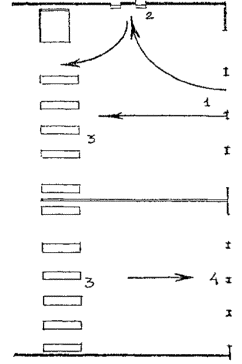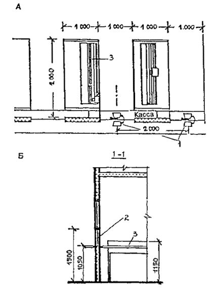 Черт. 26. Фрагмент плана стойки регистрации 1 - стойка регистрации; 2 - весы-транспортеры; 3 - проходы для пассажиров; 4 - специальный проход для инвалидов на колясках шириной не менее 90 см