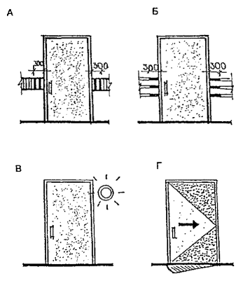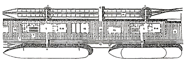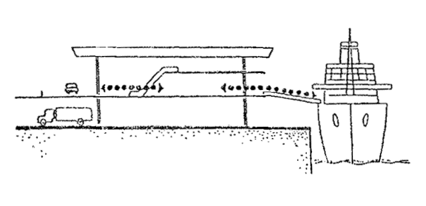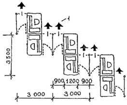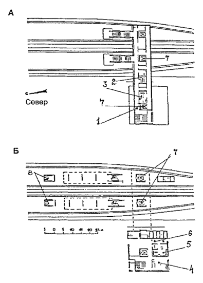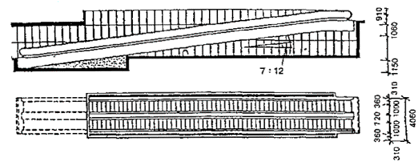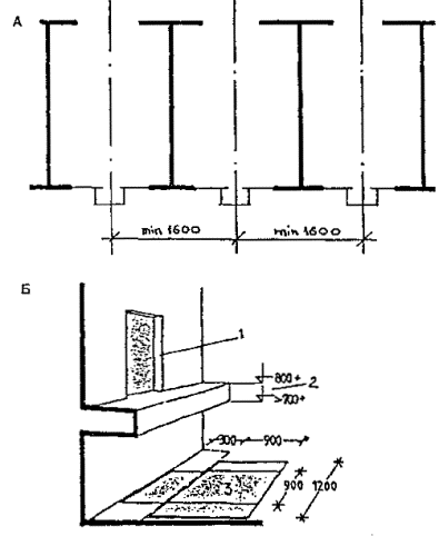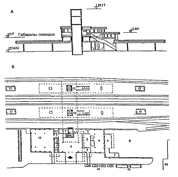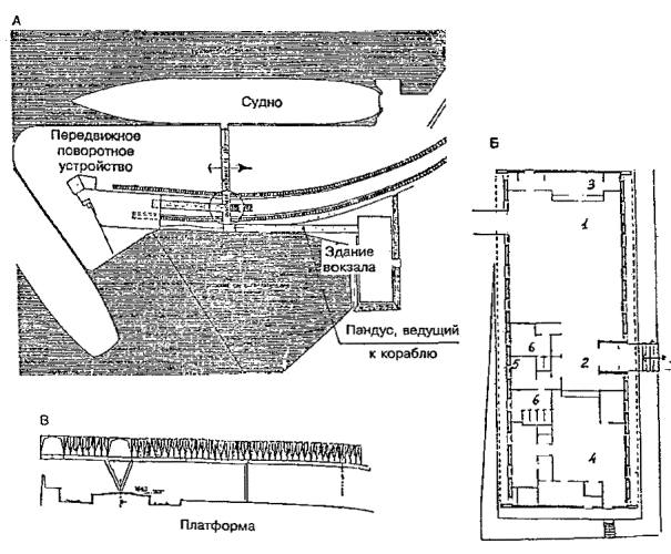 Черт. 41. Расположение вокзала А - вход пассажиров; Б - направление движения поездов Примеры многоярусных решений · Перпендикулярное по отношению к перрону расположение помещений вокзала облегчает связь с островными платформами и превращает корпус вокзала или его часть в своеобразный мост-переход (черт. 42). Черт. 42. Железнодорожный вокзал в г. Харлоу А - поперечный разрез; Б - план; 1 - операционный зал; 2 - кассы; 3, 4 - багажное отделение; 5, 6 - вывоз багажа; 7 - пандус; 8 - багажный двор; 9, 10 - служебно-технические помещения; 11 - киоски; 12 - лифты; 13 - хранение велосипедов; 14 - подъезд автомобилей; 15 - подъезд автобусов; 16 - автостоянки; 17 - пассажирские павильоны на платформах · Для связи с островными платформами вокзала в Броксберне сооружен крытый мост-переход над путями (черт. 43). В центральной части перехода запроектированы зал ожидания (1), туалетные (2), служебные комнаты (3). На первом этаже основного здания находятся операционный зал (4) с кассами (5) и справочным бюро (6), багажное отделение. · Маломобильные пассажиры используют лифты (7). Небольшие залы ожидания, доступные для инвалидов, имеются непосредственно на перронах (8). Черт. 43. Вокзал в г. Броксберне А - план 2-го этажа; Б - план 1-го этажа ВОКЗАЛЫ ВОДНОГО ТРАНСПОРТА· В случаях примыкания к зданию вокзала водного транспорта железнодорожных путей пассажирских линий (более одного пути) и устройства стационарной переходной галереи, кроме лестницы и пандусов, для попадания инвалидов на ее уровень рекомендуется устройство лифтов (преимущественно в объеме здания) или специальных выжимных устройств - платформ (при наружном размещении галереи) (черт. 44). Черт. 44. Морской порт в г. Гавре (Франция). План в уровне основного этажа 1 - вестибюль; 2 - служебные помещения; 3 - досмотровые залы; 4 - переходные мостики на железнодорожные платформы; 5 - залы-салоны; 6 - галерея; 7 - открытый балкон; 8 - передвижные трап-порталы; 9-11 - служебные помещения; 12 - автостоянки; 13 - автомобильный мост; 14 - железнодорожные платформы; 15 - площадка для грузового транспорта; 16 - технические помещения · Морской вокзал в г. Адроссане (Шотландия) является положительным примером решения пересадочного узла (железная дорога - водный транспорт), а также обеспечения одноуровневого перехода из здания морского вокзала на борт судна посредством оригинальной галерейной конструкции передвижного поворотного устройства. Однако для подъема инвалидов с платформы на галерею необходимы либо применение выжимного устройства, либо помощь сопровождающего лица для въезда по пандусу, не обеспечивающему нормируемого для инвалидной коляски уклона (черт. 45). Черт. 45. Морской вокзал в г. Адроссане (Шотландия) А - генеральный план; Б - здание вокзала; В - фрагмент передвижного поворотного средства; 1 - зал ожидания; 2 - вестибюль; 3 - кафетерий; 4 - административные помещения; 5 - комната отдыха; 6 - санузлы АЭРОВОКЗАЛЫ· Для аэровокзалов нашей страны наиболее характерно одноуровневое решение привокзальной площади и одно-, двухуровневое - зоны для пассажиров здания аэровокзала. Так выполнены крупные аэровокзалы Москвы - Шереметьево-1, Внуково-1, Домодедово, центральный городской. · Для инвалидов и маломобильных пассажиров при таких решениях возникает множество барьеров: на привокзальной площади, имеющей форму сильно вытянутого прямоугольника или трапеции и рассчитанной на пе