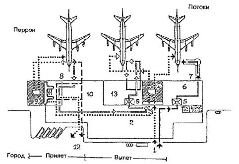Черт. 24. Схема горизонтального зонирования здания аэровокзала и размещения основных групп помещений 1 - вход для вылетающих пассажиров; 2 - общий зал; 3 - зона регистрации и сдачи багажа; 4 - багажное помещение вылета; 5 - зона спецдосмотра; 6 - зал-накопитель вылета; 7 - перрон вылета; 8 - перрон прибытия; 9 - багажное помещение прилета; 10 - зал ожидания прилетевших пассажиров; 11 - зона выдачи багажа; 12 - выход; 13 - зал транзитных и трансферных пассажиров; 14 - зона в общем зале для маломобильных пассажиров · Для перемещения инвалидов и маломобильных пассажиров в зданиях аэровокзалов большой протяженности следует использовать движущиеся тротуары или другие механизированные средства передвижения. Второй вариант - в центральной части здания для пассажиров этой группы следует предусмотреть специальный выход на перрон. · В многоэтажных зданиях аэровокзалов зона для пассажиров, как правило, занимает два уровня. Наиболее часто верхний уровень (уровень входа в самолет) предназначается для вылетающих пассажиров, нижний (уровень земли) - для прибывающих и перемещения багажа (черт. 25-28). · Для передвижения между уровнями инвалидов и маломобильных пассажиров следует устраивать лифты, пандусы, эскалаторы и специальное оборудование лестничных маршей. При их отсутствии следует предусматривать для инвалидов на колясках и маломобильных пассажиров специальный выход на перрон в уровне первого этажа. Условные обозначения