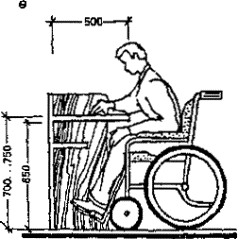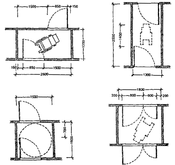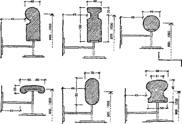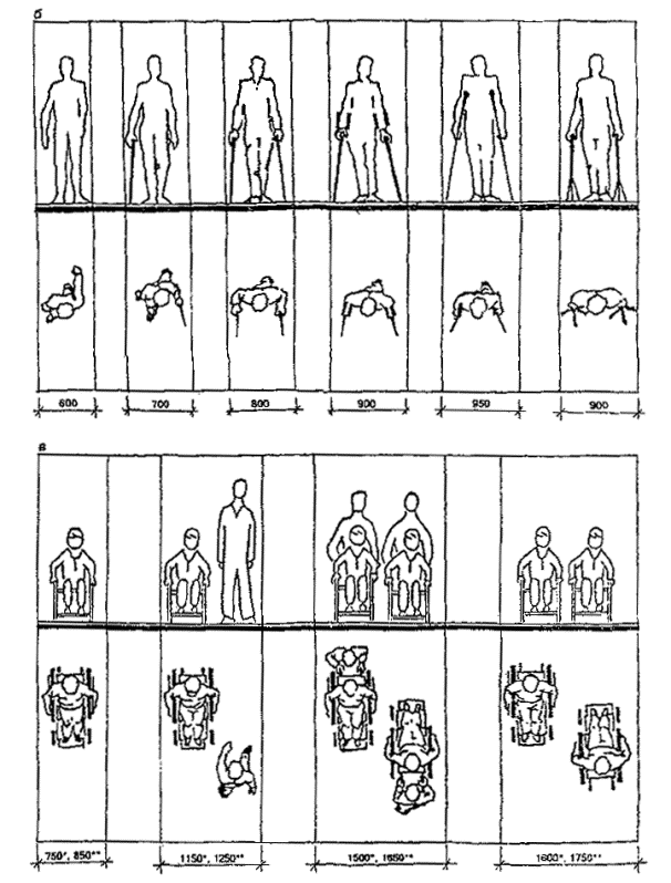 · Ширина пандуса принимается не менее 900 мм. Поперечный уклон - 2 %, высота боковых бортиков - 50 мм. · Горизонтальная площадка перед входной дверью в зоне пандуса должна быть не менее 1500 мм для возможного разворота кресла-коляски. · При длине пандуса более 6 м следует предусматривать промежуточные площадки длиной не менее 1700 мм. В начале и конце каждого пандуса также следует предусматривать горизонтальные площадки длиной 1700 мм и шириной, равной самому пандусу. · Наружные и внутренние лестницы и пандусы, предназначенные для использования детьми-инвалидами, с обеих сторон должны иметь опорные поручни-перила на высоте от уровня пола 500 мм для дошкольников; 700 и 900. мм для школьников. Длина поручней должна быть больше длины пандуса или лестничного марша с каждой стороны не менее чем на 300 мм. · Поручни должны быть округлого сечения диаметром не менее 30 мм и не более 60 мм. Пространство в свету между перилами и стеной должно быть не менее 40 - 45 мм (рис. 29). Поверхность захвата не должна прерываться стойками перил на концах маршей или другими конструктивными элементами. Рис. 29. Опорные поручни и перила лестниц и пандусов в адаптируемых к посещению детьми-инвалидами учебно-воспитательных зданиях · Вертикальные элементы ограждения пандусов должны иметь просвет не более 0,1 м. Горизонтальные членения ограждений не допускаются. Поручень должен располагаться строго параллельно поверхности пандуса и заканчиваться плавными закруглениями. · Поручни на лестницах в учреждениях для детей-инвалидов предусматриваются по всей длине маршей с обеих сторон и периметру промежуточных площадок. ЛИФТЫ· В многоэтажных учебно-воспитательных зданиях лифты являются основным средством доставки инвалидов в помещения, расположенные на верхних этажах. · Лифт или лифты должны располагаться рядом с главным входом в здание и должны быть четко обозначены. Из всех имеющихся в здании лифтов по меньшей мере один должен проектироваться так, чтобы он был доступен и удобен для пользования инвалидами. · Выход из лифта на первом этаже следует предусматривать в холл или вестибюль, отделенный от других помещений противопожарными перегородками и дверями. Расположение лифтовых холлов и площадок на путях следования инвалидов, на промежуточных лестничных уровнях запрещается. · Во всех зданиях, помещения которых расположены выше первого этажа и предназначены для использования детьми-инвалидами, следует предусматривать лифты, кабины которых должны иметь размеры не менее: ширину - 1100 мм; глубину - 1350 мм; ширину дверного проема - 800 мм (рис. 30). Рис. 30. Оборудование лифтов в адаптируемых к посещению детьми-инвалидами учебно-воспитательных и реабилитационных зданиях · Минимальный размер площадки перед лифтом, достаточный для разворота кресла-коляски, равен 1400 ´ 1600 мм. · Величина перехода уровней между полом кабины лифта и площадкой лифтового холла не должна превышать 25 мм. · Кнопки вызова в лифтовых вестибюлях и холлах, адаптируемых для пользования инвалидами, должны располагаться на высоте 1000-1200 мм от уровня пола. Кнопки вызова должны иметь визуальные световые сигналы, причем кнопки, предназначенные для направлений вверх, должны быть вверху. Размер кнопки вызова должен быть минимум 19 мм в наименьшем измерении. · У каждого лифта, используемого инвалидами, должны предусматривать