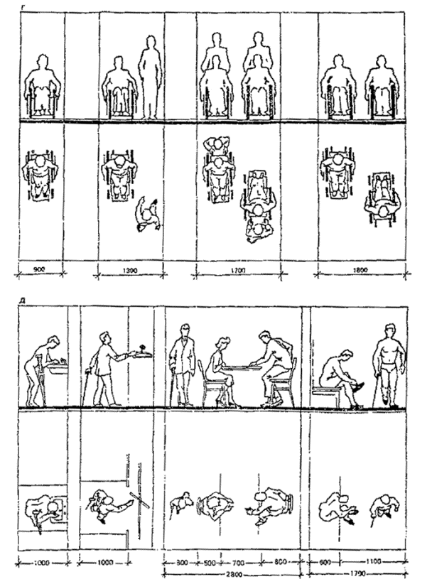ЭРГОНОМИЧЕСКИЕ ДАННЫЕ· В разделе представлены иллюстрации с эргономическими данными для детей и подростков в возрасте от 3 до 18 лет, пользующихся дополнительными приспособлениями при передвижении (палки, костыли, кресла-коляски и пр.). Эти данные следует учитывать при проектировании коммуникационных связей в здании, помещений различного назначения, расстановки стационарных элементов оборудования и мебели (рис. 2). · Для проектирования комфортной среды в зданиях для воспитания, обучения и реабилитации детей-инвалидов, пользующихся креслами-колясками, необходимо учитывать габариты разворота коляски по трем возрастным группам: до 7 лет; от 7 до 13 лет, от 13 до 18 лет (рис. 3).