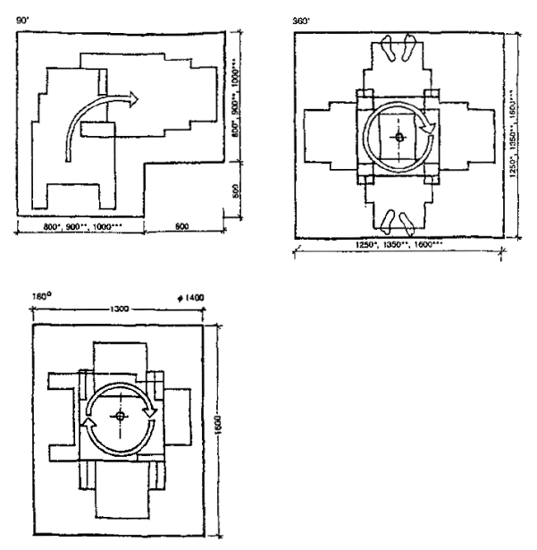 Рис. 2. Эргономические данные а - минимальная ширина прохода для детей 3-13 лет, пользующихся дополнительными приспособлениями при передвижении; б - то же, для подростков 13-18 лет; в - минимальная ширина прохода для детей 3-13 лет, пользующихся креслами-колясками; г - то же, для подростков 13-18 лет; д - минимальные габариты некоторых эргономических зон; * - для детей 3-7 лет; ** - для детей 7-13 лет Рис. 3. Необходимые габариты для разворота кресла-коляски * - для детей до 7 лет; ** - для детей 7-13 лет; *** - для подростков 13-18 лет 2. Земельные участкиТЕРРИТОРИЯ УЧАСТКА· Территории специализированных учебно-воспитательных зданий должны размещаться на обособленных участках в озелененных районах или пригородной зоне, на расстоянии не менее 3000 м от промышленных и коммунальных предприятий, железнодорожных путей и дорог с интенсивным движением транспорта, а также других источников шума, загрязнения воздуха и почвы. · Учреждения для детей с нарушением зрения и слуха следует располагать в районах, удаленных не менее чем на 1500 м от радиостанций, радиорелейных установок-пультов в связи с необходимостью исключения возможностей нарушения работы аудиометрической аппаратуры. · В вечернее время участок должен освещаться из расчета обеспечения освещенности на земле не менее 20 лк при лампах накаливания и не менее 40 лк - при люминесцентных лампах. · При въезде на участок необходима автомобильная стоянка на 6-10 легковых машин. · Участки необходимо ограждать забором высотой не менее 2 м с высадкой кустарника вдоль его внутренней стороны. · Для территории дошкольных учреждений и школ общего типа, адаптируемых к пребыванию детей-инвалидов, необходимо, по возможности, соблюдать вышеперечисленные требования. ПЛОЩАДИ УЧАСТКОВ· Площадь участка специализированного дошкольного учреждения следует принимать не менее 60 м2 на 1 место. · Площадь земельных участков спецшкол-интернатов приведена в табл. 2. · Площадь земельных участков домов-интернатов показана в табл. 3. Таблица 2