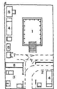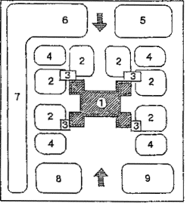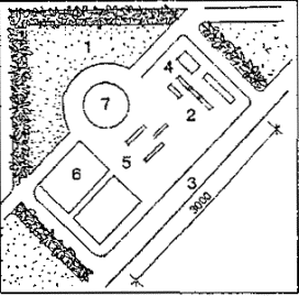 ЗОНИРОВАНИЕ УЧАСТКОВ· На земельных участках специализированных дошкольных учреждений следует размещать площадки: групповые с теневым навесом, коррегирующей гимнастики, физкультурных занятий, адаптации и обучения правилам поведения на улицах; оздоровительных процедур с плескательным бассейном (для II и III климатических поясов), хозяйственную, ознакомления с живой природой (рис. 4). · На земельных участках спецшкол-интернатов следует предусматривать зоны: физкультурно-спортивную, реабилитационную, учебно-опытную, отдыха, хозяйственную (рис. 5). · При зонировании участка необходимо обеспечивать прямую планировочную связь; физкультурно-спортивной и реабилитационной зон с блоками спортивных и медицинских помещений, зонами отдыха, зоной дошкольного отделения; учебно-опытной зоны с блоками учебных помещений старших школьников, хозяйственной зоной; зон отдыха учащихся всех возрастов с блоками жилых помещений соответствующих возрастных групп. · На земельном участке дома-интерната для умственно отсталых детей предусматриваются следующие площадки: групповые и общая; учебно-опытная; отдыха и встреч с родственниками; хозяйственная. Рис. 4. Зонирование участка дошкольного учреждения, посещаемого детьми-инвалидами 1 - дошкольное учреждение; 2 - групповые площадки; 3 - теневой навес; 4 - площадки коррегирующей гимнастики; 5 - плескательный бассейн; 6 - физкультурная площадка; 7 - площадка по обучению правилам поведения на улице; 8 - хозплощадка; 9 - уголок живой природы Рис. 5. Зонирование участка спецшколы-интерната, посещаемого детьми-инвалидами Блоки: 1 - общешкольных помещений; 2 - учебно-жилых помещений; 3 - медицинских помещений. Площадки: А - для выращивания растений и ухода за животными; Б - учебно-опытная (для средних и старших школьников); В - учебно-опытная для (младших школьников; Г - спортивная; Д - спортивная для младших, школьников; Е - реабилитации; Ж - отдыха для младших школьников; И - парковая; К - общешкольных мероприятий ЭЛЕМЕНТЫ ТЕРРИТОРИИ· Групповые площадки проектируются для каждой группы воспитанников, способных к самостоятельному обучению. · Площадь групповых площадок для умственно отсталых детей должна быть не менее 200 м2. Площадки для детей, неспособных к обучению, должны иметь ограждения. · Площадь групповых площадок для детей с нарушением слуха, зрения и опорно-двигательного аппарата должна быть не менее 10 м2 на 1 место. · На групповых площадках следует предусматривать теневые навесы для укрытия детей от атмосферных осадков, излишней солнечной радиации, сильных ветров. · Необходимо обеспечить удобную связь групповых площадок с входами в соответствующие групповые ячейки и с физкультурной площадкой. · Поверхность групповой площадки для детей с нарушением зрения должна быть ровной и иметь ограждающую полосу с другой поверхностью покрытия шириной 1-1,5 м, причем ограждающую полосу лучше делать наклонной с постепенным подъемом в 10-12°. · Физкультурная площадка должна быть площадью не менее 250 м2. На физкультурной площадке следует выделять зону для игр с мячом, зону для лазания, беговую дорожку не менее 30 м, яму для прыжков, зону для гимнастических снарядов и спортивных игр (рис. 6). Рис. 6. Функциональные зоны физкультурной площадки 1 - зона для игр с мячом; 2 - зона для лазания; 3 - беговая дорожка; 4 - яма для прыжков; 5 - зона для гимнаст