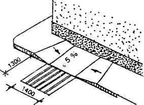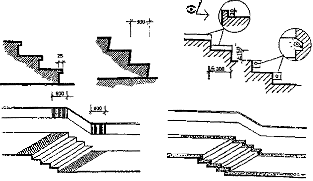 Рис. 27. Оборудование лестниц в адаптируемых к посещению детьми-инвалидами учебно-воспитательных зданиях · В любом пролете лестниц все ступени должны быть постоянной высоты подъема и постоянной ширины. Открытые подступени не допускаются. · Для инвалидов по зрению начало и конец лестничных маршей должны быть выделены цветовой рельефной поверхностью пола на расстоянии 600 мм от начала и конца ступеней. Площадка между маршами должна быть длиной не менее 1200 мм. Кроме того, передняя кромка каждой ступени должна быть контрастного цвета. Фактурные и цветовые полосы по полу и стене вдоль боковых сторон лестничных маршей и пандусов также рекомендуются в учреждениях для детей с недостатками зрения. · По не примыкающим к стенам боковым краям лестничного марша ступени должны иметь бортики высотой не менее 0,02 м. · В учреждениях для детей со зрительными аномалиями может быть рекомендована боковая подсветка ступеней. · Из соображений основного требования доступности для инвалидов-колясочников в местах, где имеется изменение уровня пола более чем на одну ступеньку, следует предусматривать пандус (рис. 28). Рис. 28. Устройство входного пандуса в адаптированных к посещению детьми-инвалидами учебно-воспитательных зданиях · Для помещений общего назначения рекомендуется уклон пандуса 1 : 20 (8 %). Изменения уклона пандуса в зависимости от его длины и видов нарушений даются в табл. 6. Таблица 6